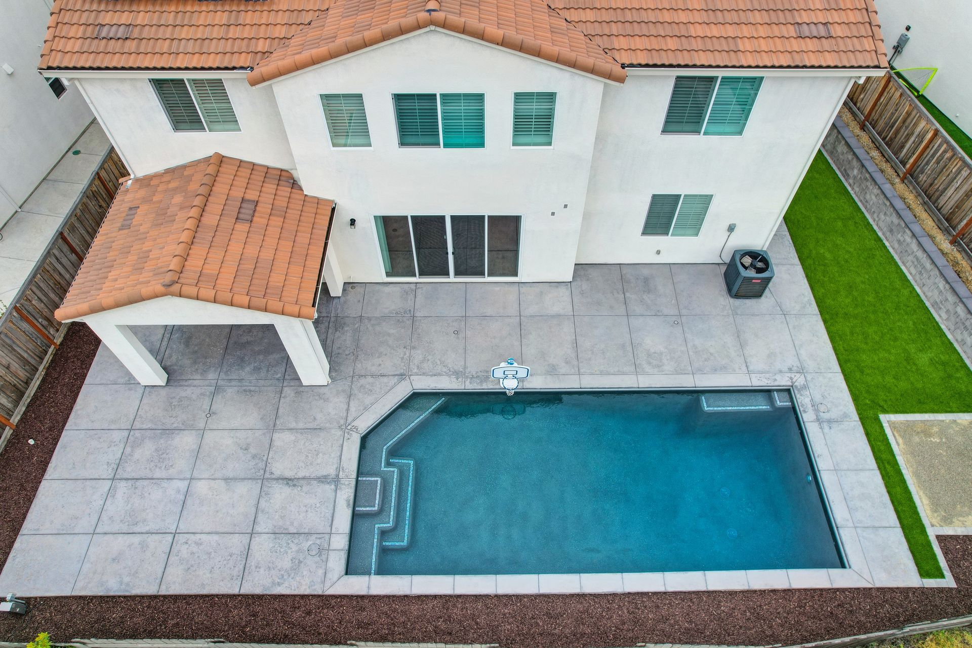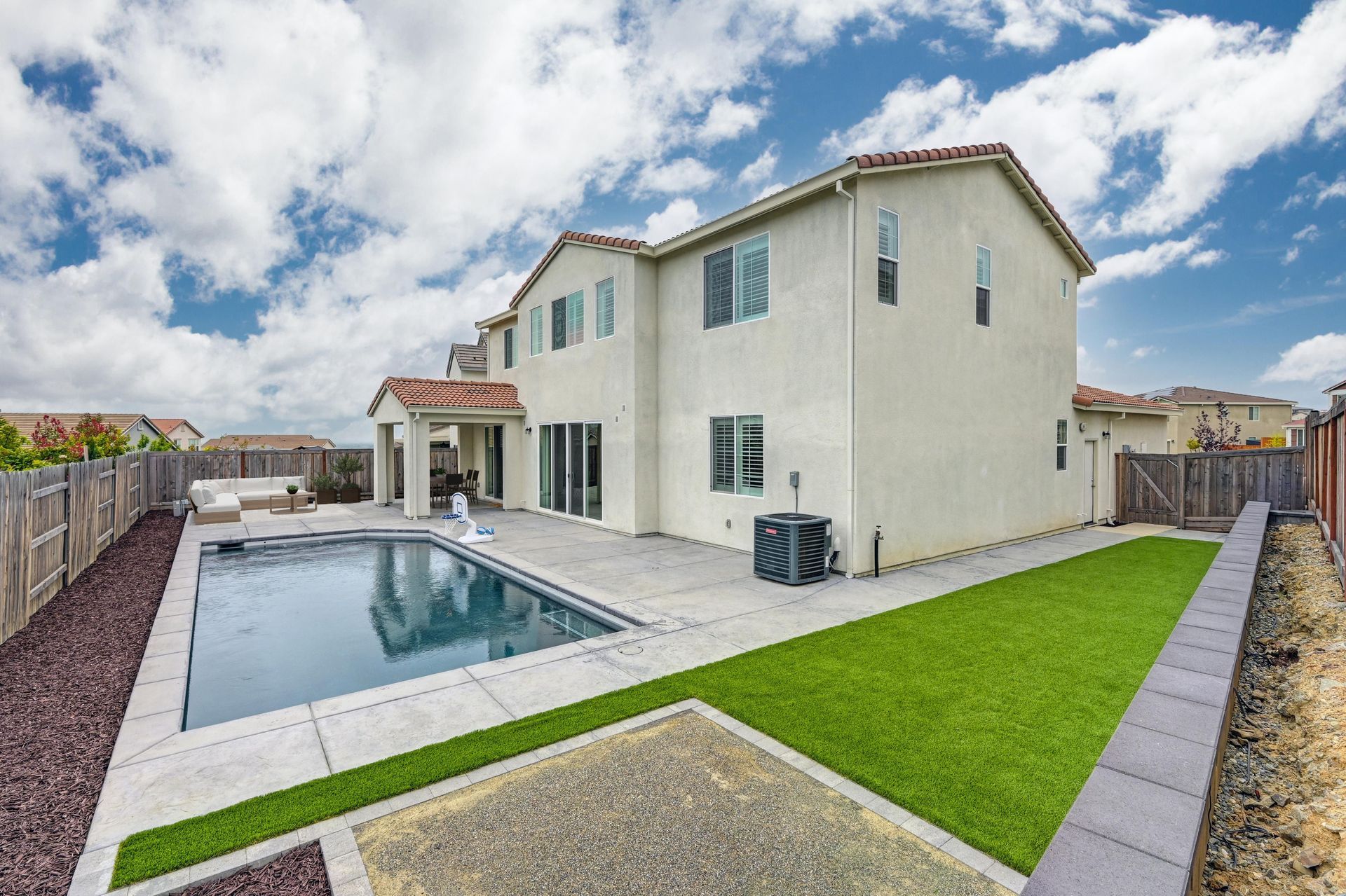 Entertain in the landscaped backyard with a covered patio, stamped concrete, new, modern shaped 8’ deep pool built by Premier Pools that sparkles with abalone shell accents, room for a spa with the electrical hookup, artificial grass, retaining wall with lighting, natural gas hookup for a BBQ, and audio pre-wire.