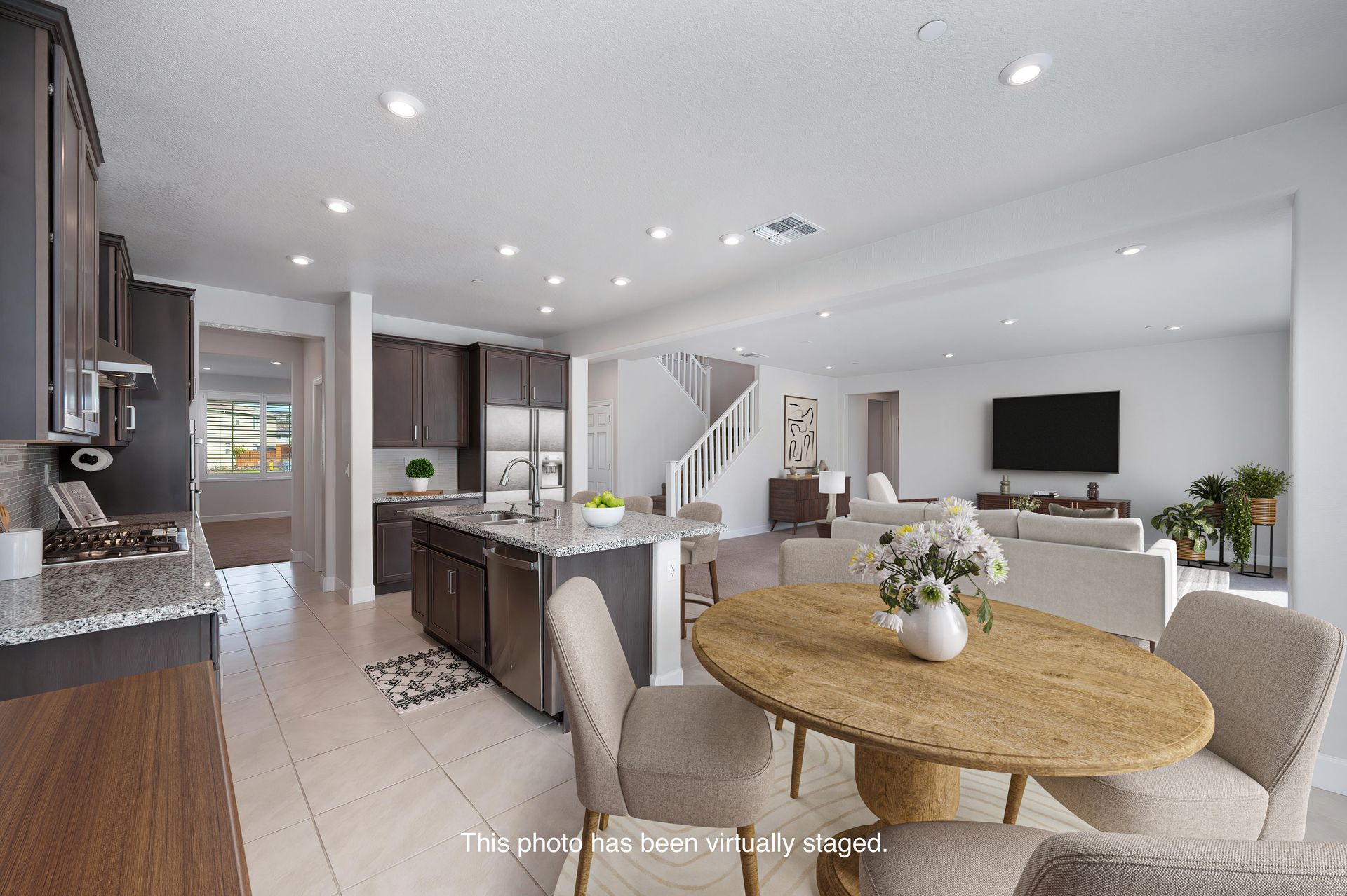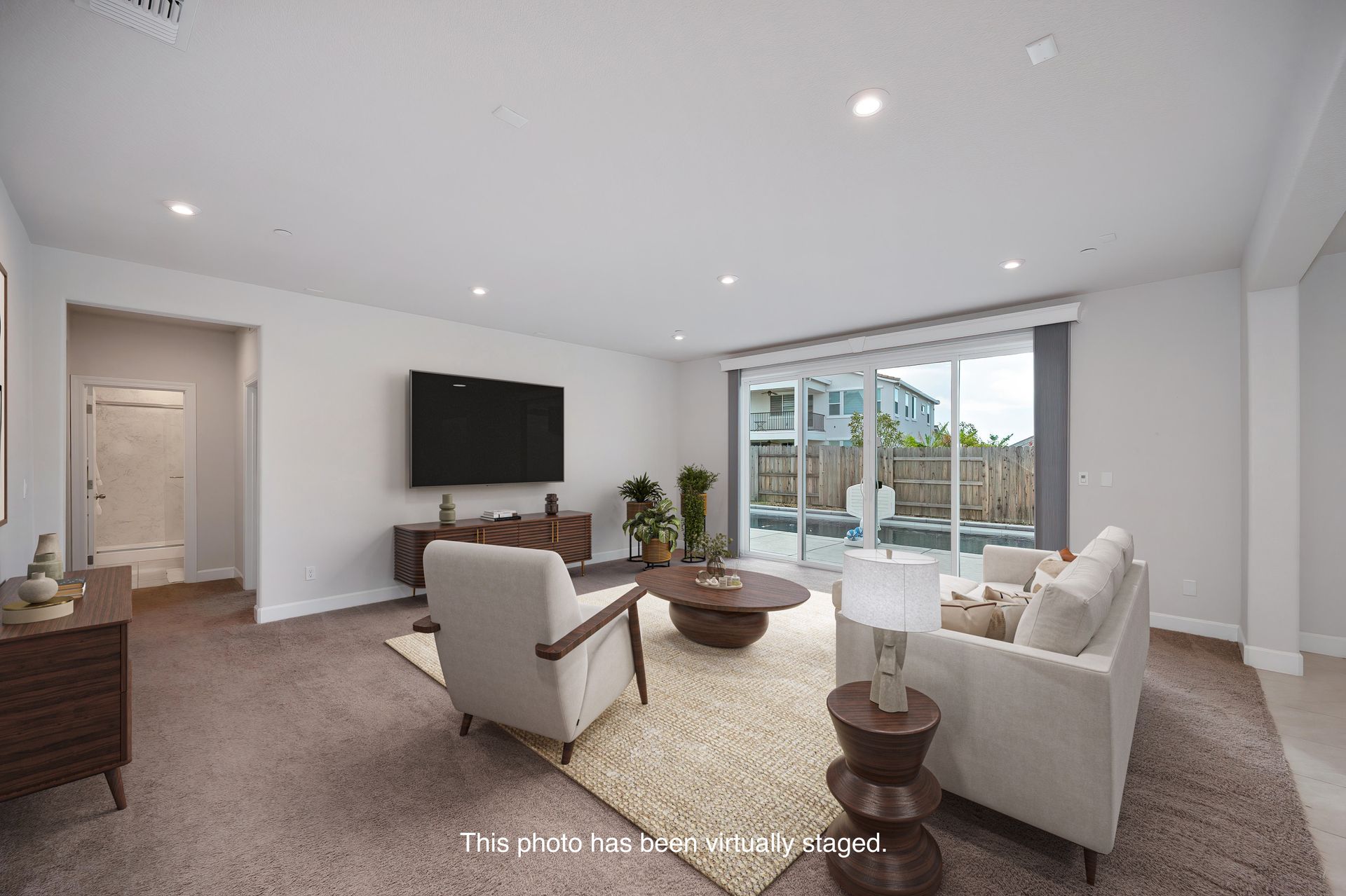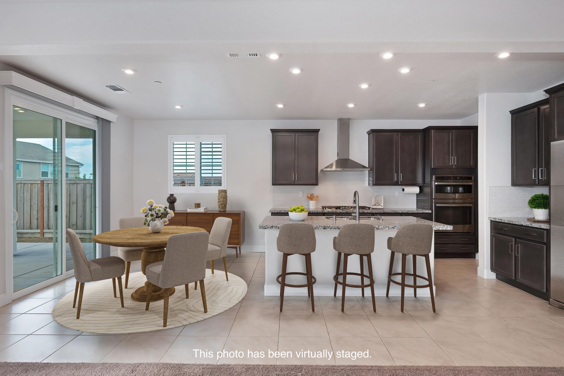 Great room with a breakfast nook and a large gathering room with surround sound pre-wire and a huge double sliding glass door to the backyard.