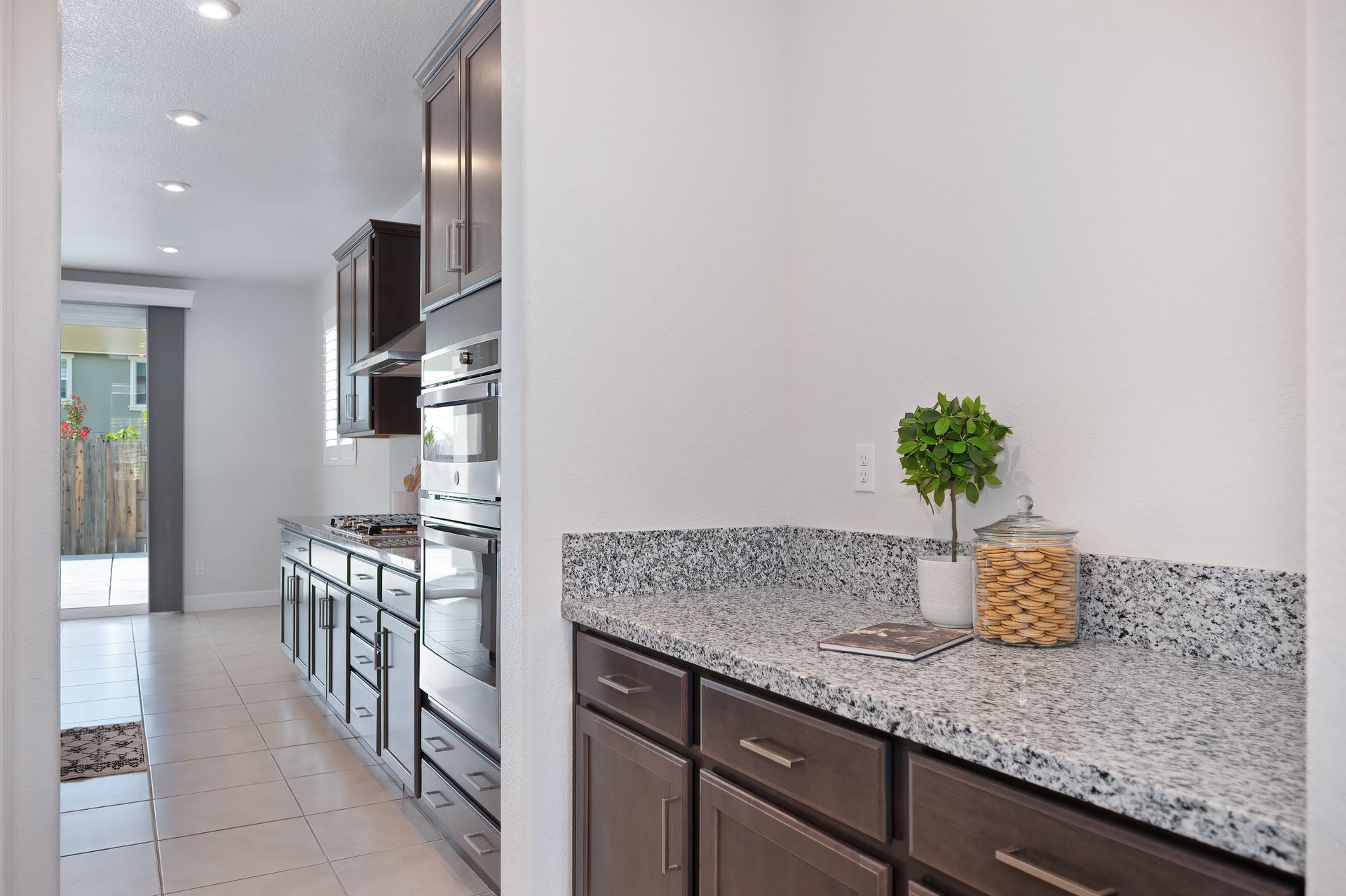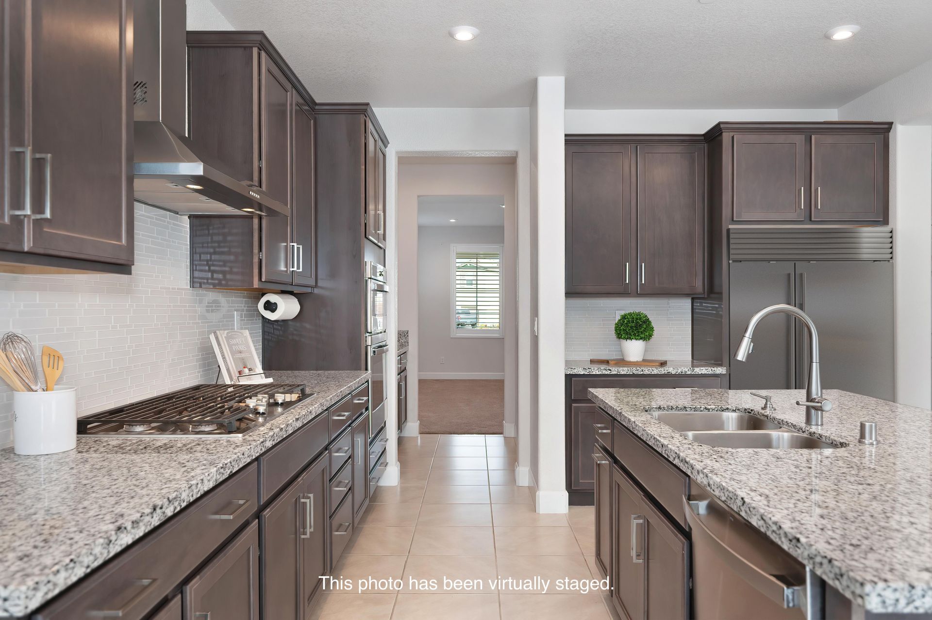 Gourmet kitchen with a large island with counter seating, granite countertops, plenty of cabinetry with decorative hardware, soft close and roll-outs, decorative tile backsplash, stainless steel appliances including a built-in cooktop and stainless hood, a butler’s pantry, and a walk-in pantry.