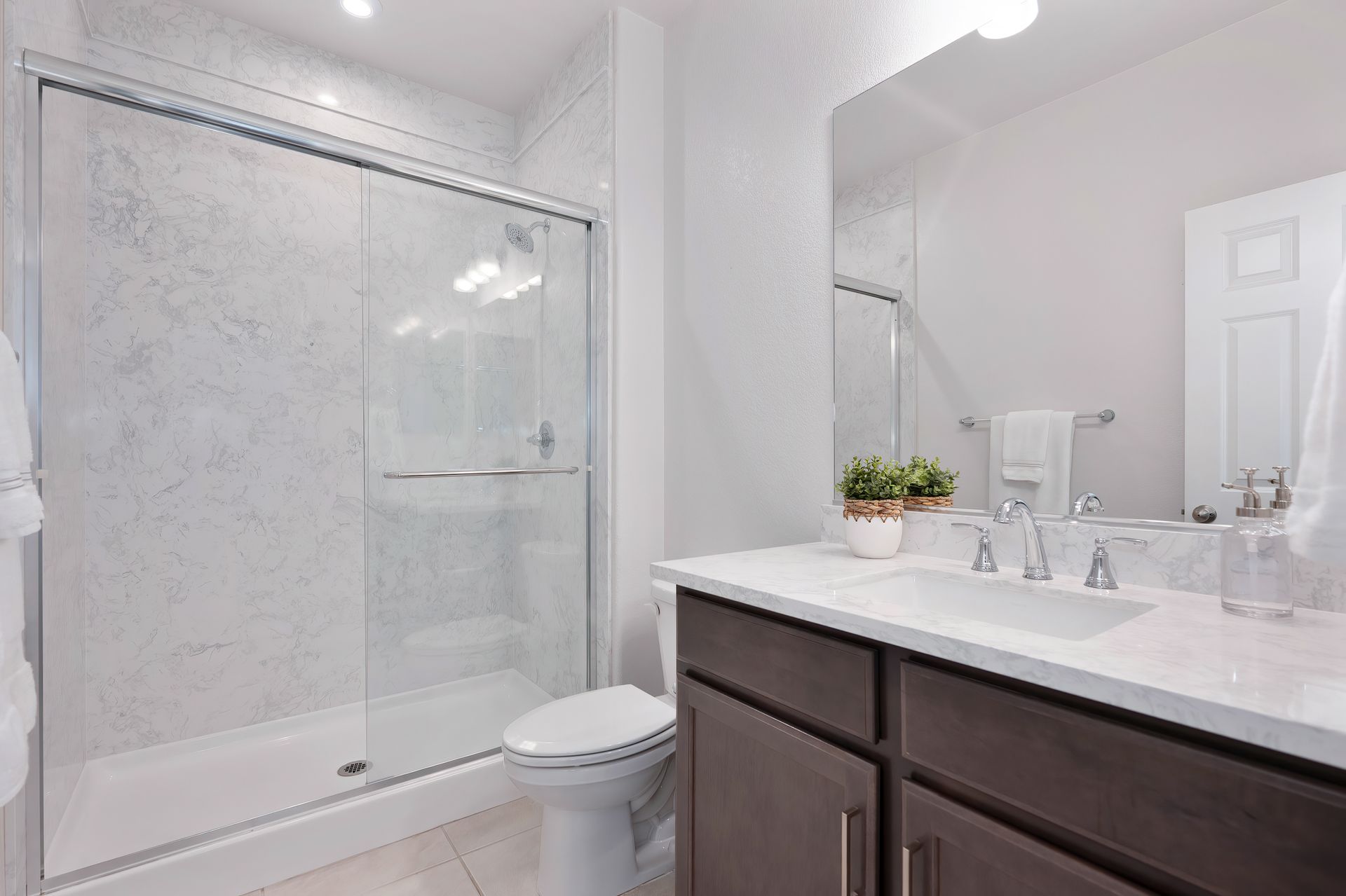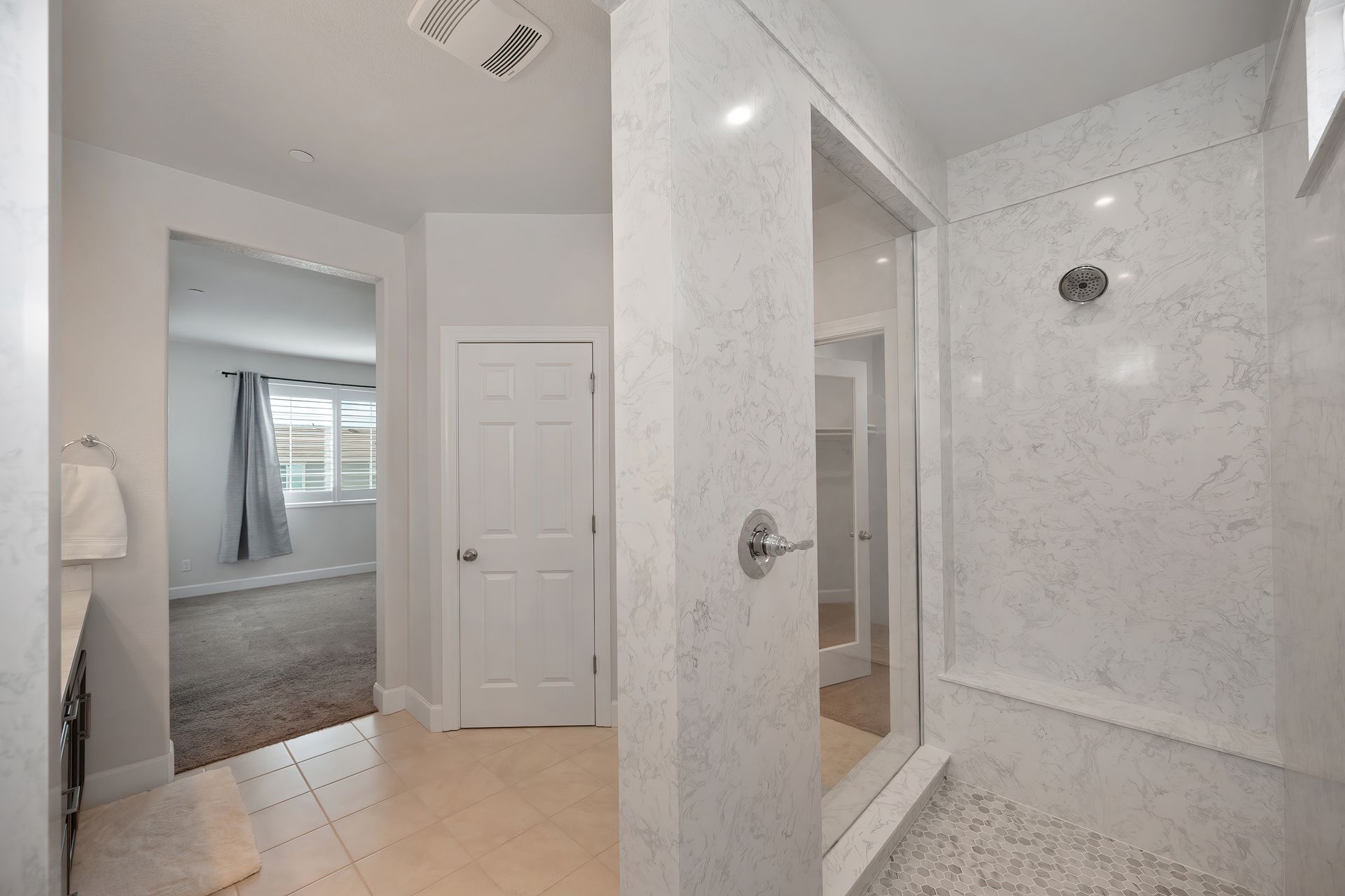 Downstairs bedroom and a full bathroom with a shower with glass doors and Piedrafina marble surround.