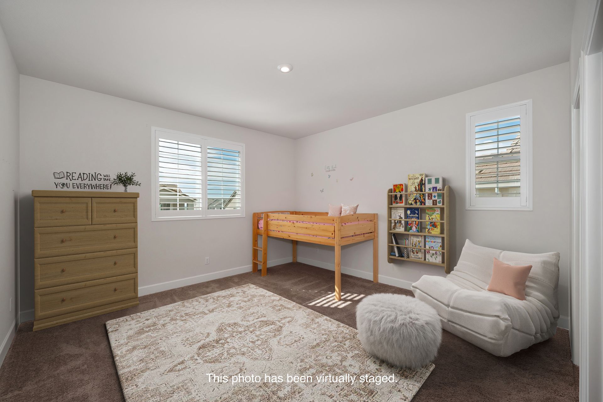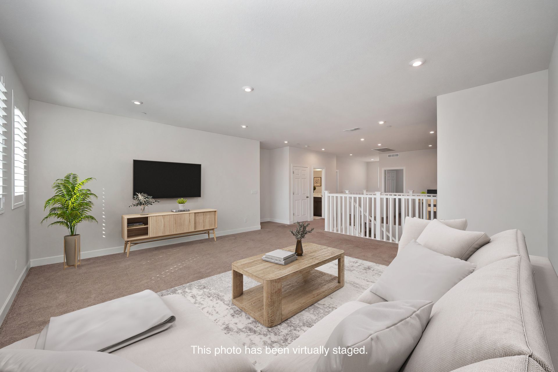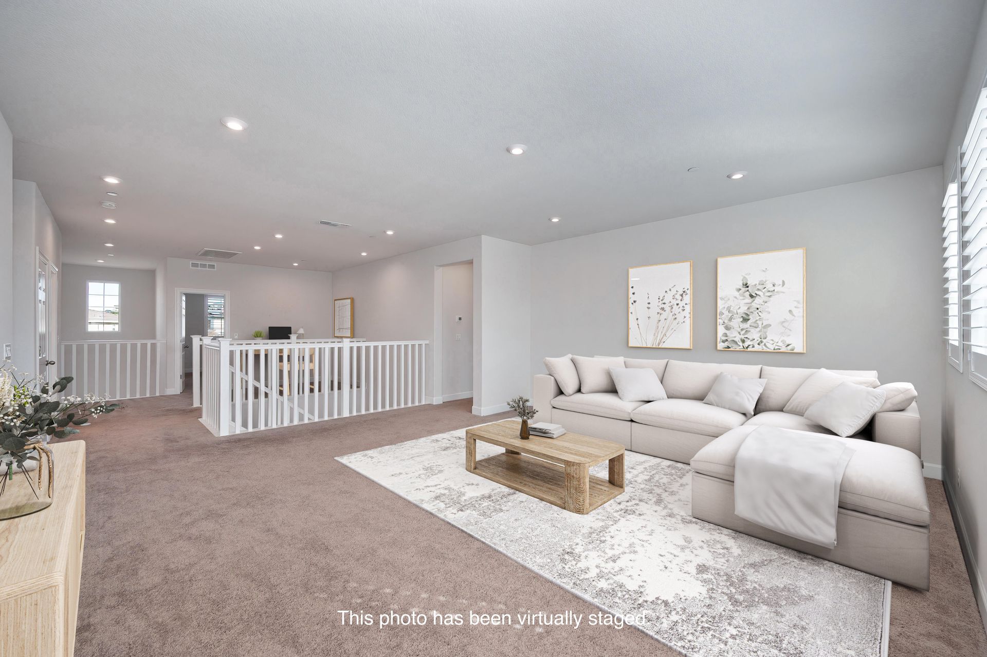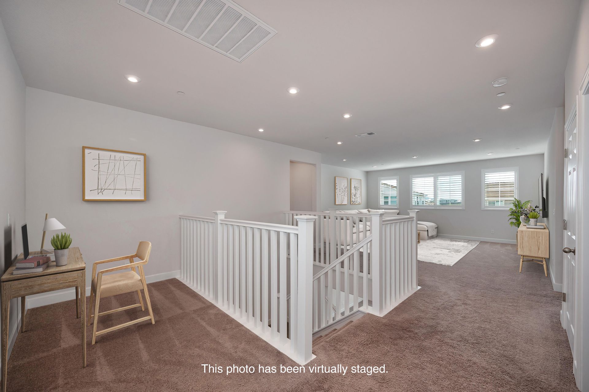 White open stair railing leads to a spacious loft and desk nook area.