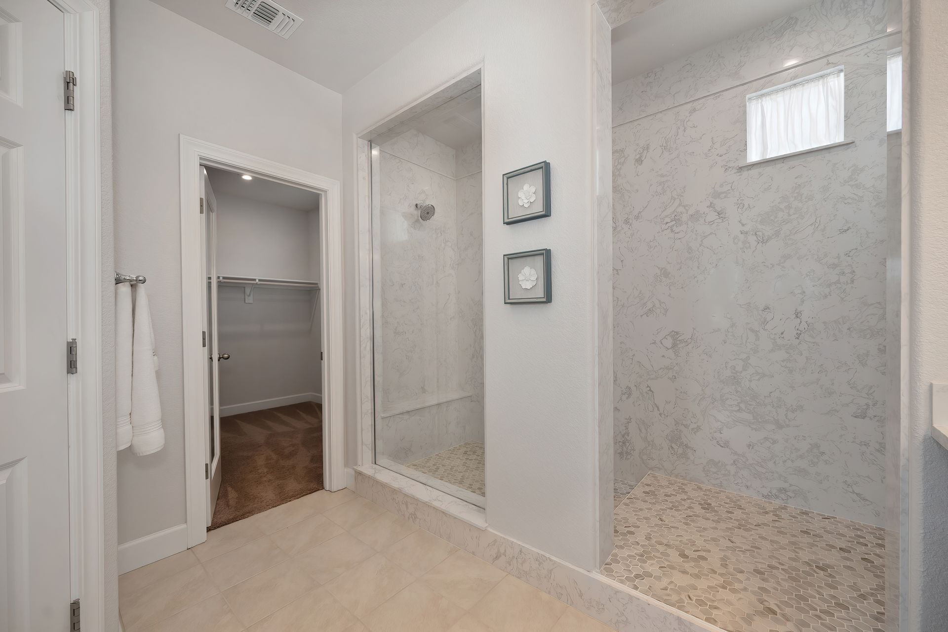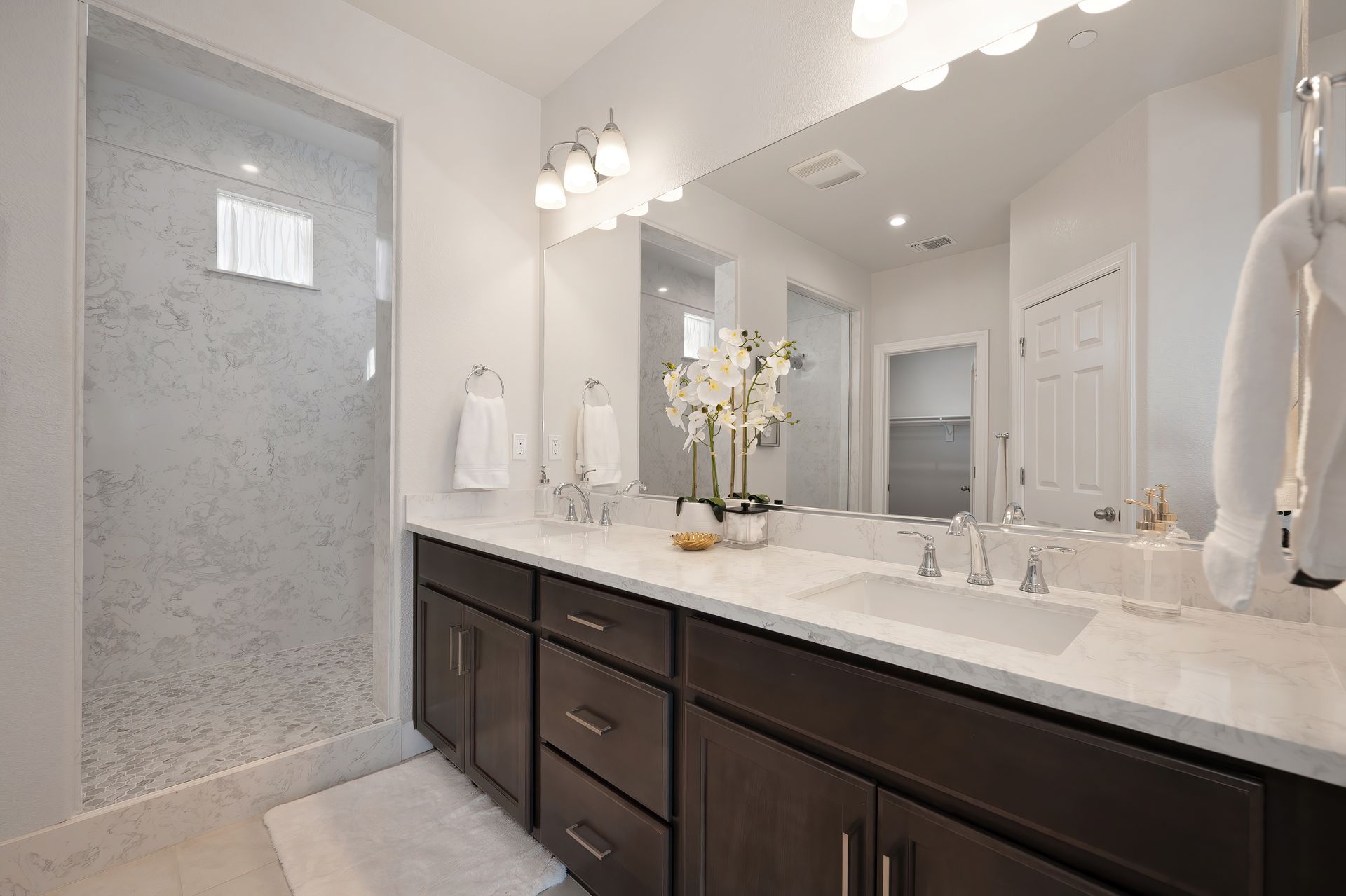 Spa-like primary bath with a large two sink vanity, super walk-in shower with a bench, Piedrafina marble surround, and decorative tile floor.