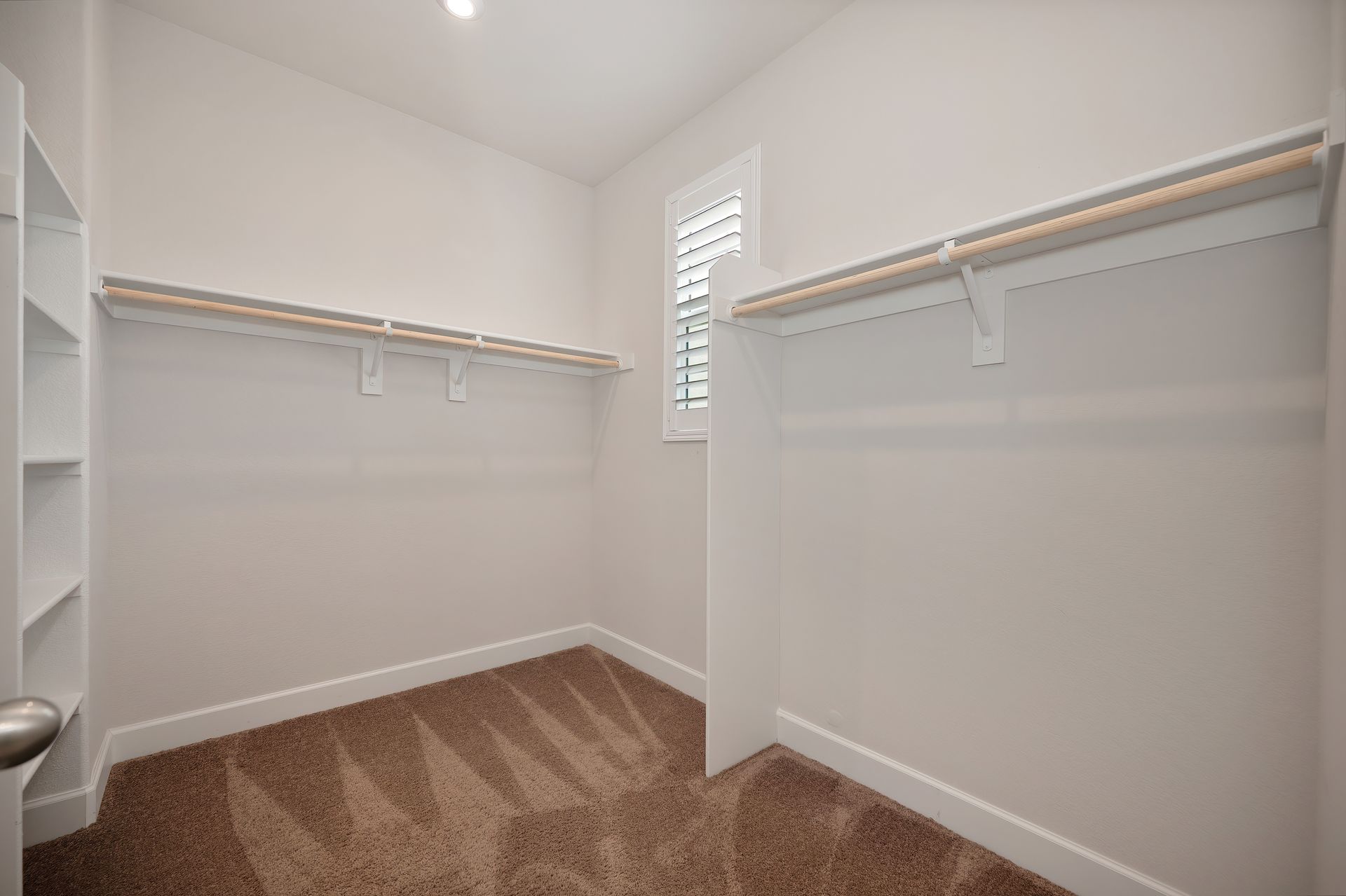 Spacious and private primary suite with a walk-in closet with shelving.