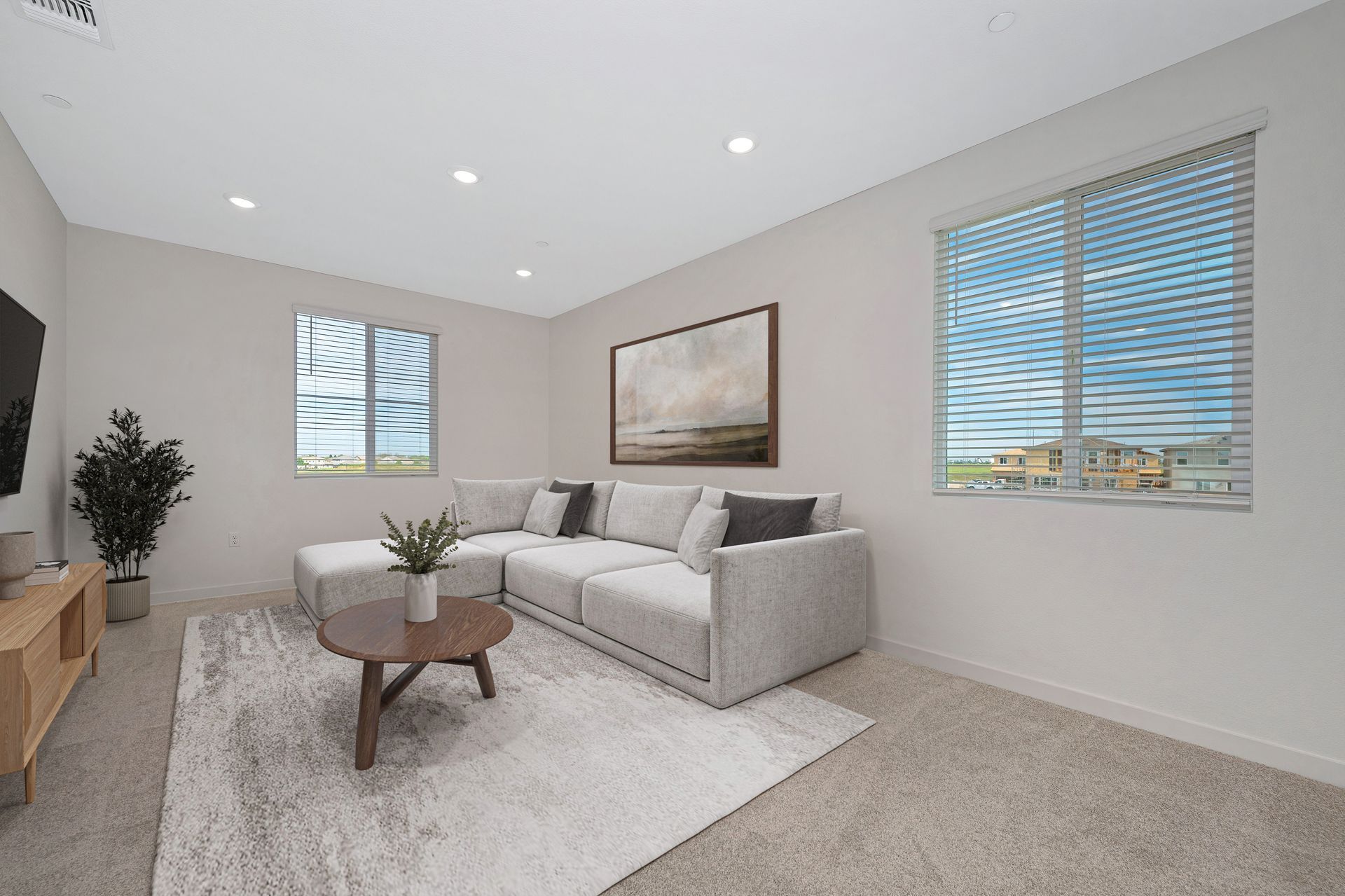 Window coverings, modern tile flooring, carpet, and abundant recessed lighting throughout.