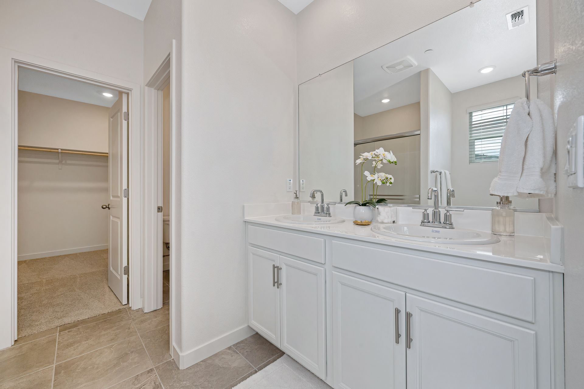 Spa-like primary bathroom with a dual sink vanity and a shower with a glass door.