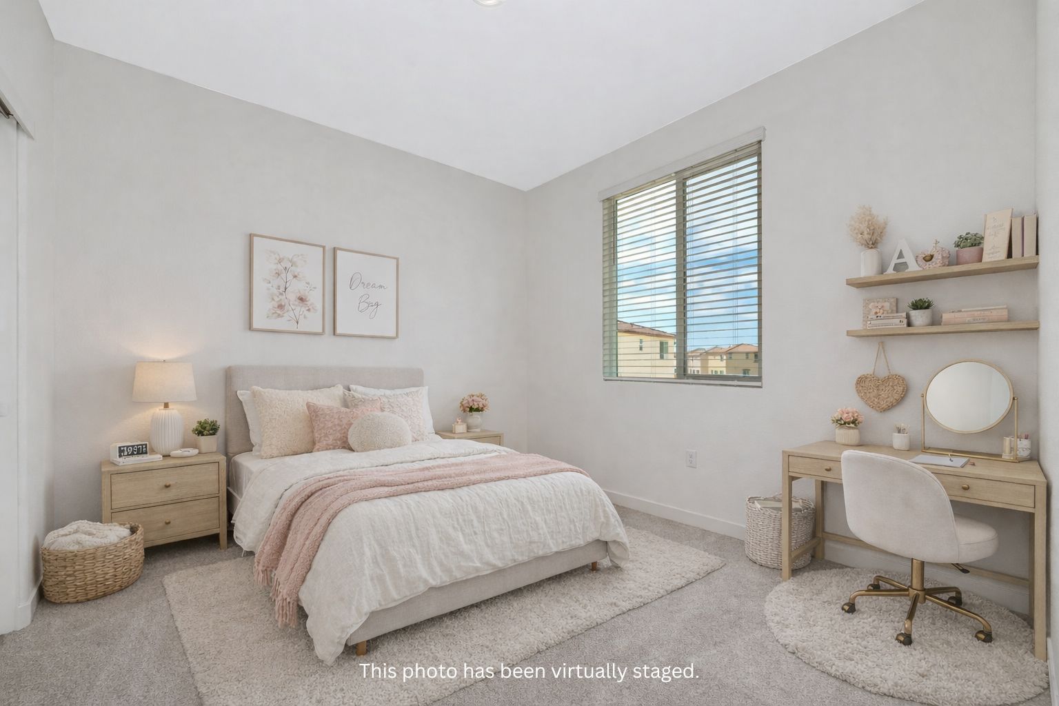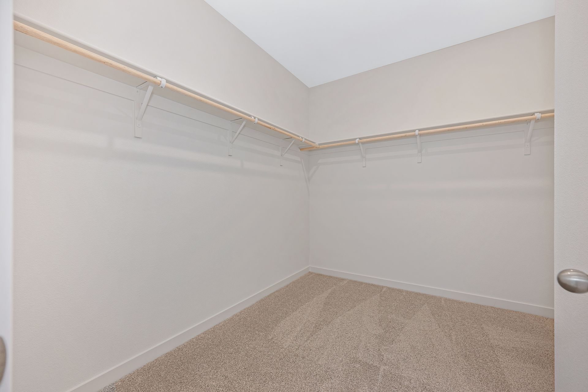 Private and spacious primary suite with a large walk-in closet with shelving.