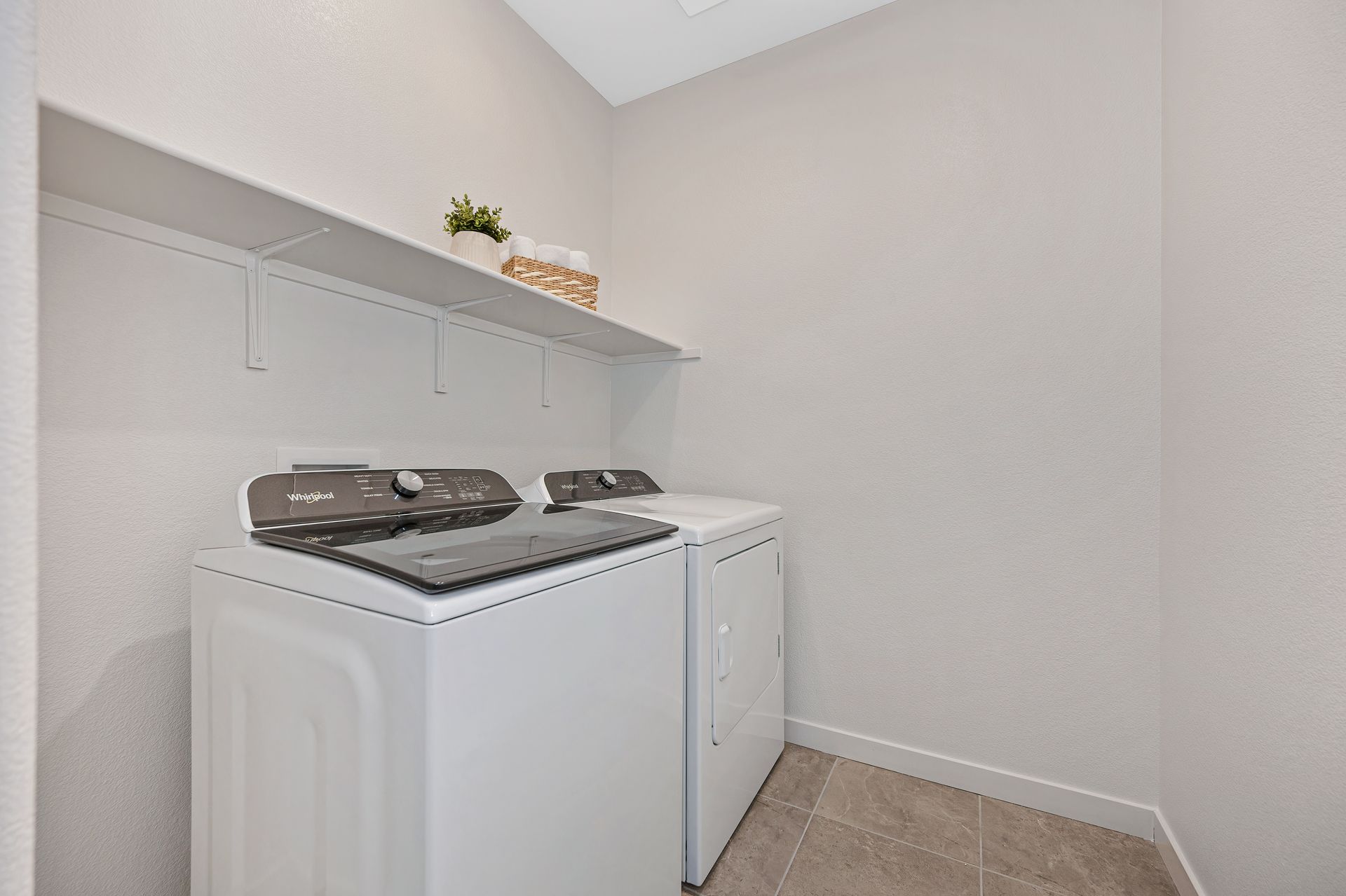 Wide hallway features a nook for storage potential. Upstairs laundry room with shelving. Coat closet and an area for a drop off station.