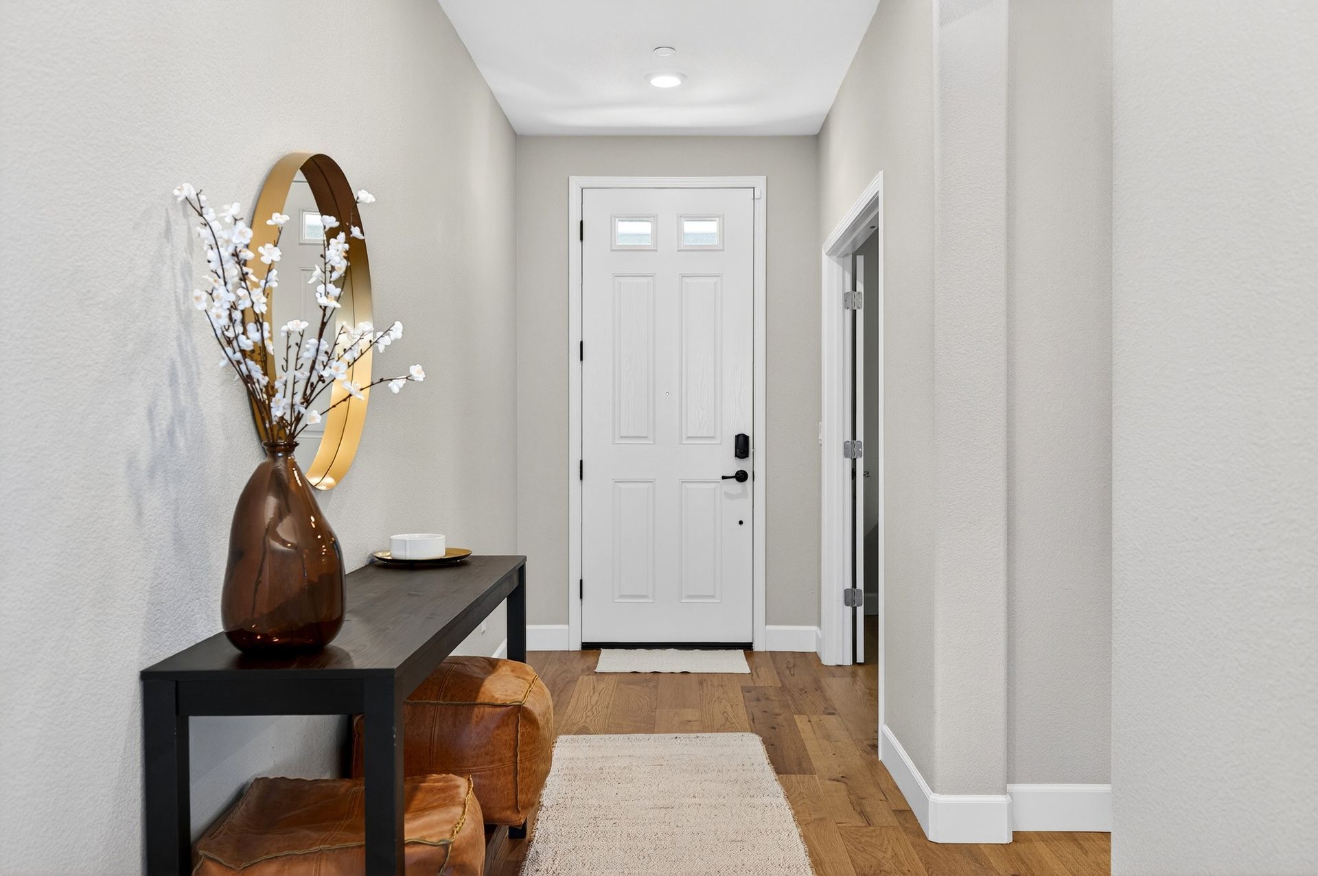 Impressive entry with a wide hallway. Gorgeous engineered hardwood flooring, upgraded tile flooring and carpet, new interior paint, ceiling fans, recessed lighting, and 5 1/4" baseboards.