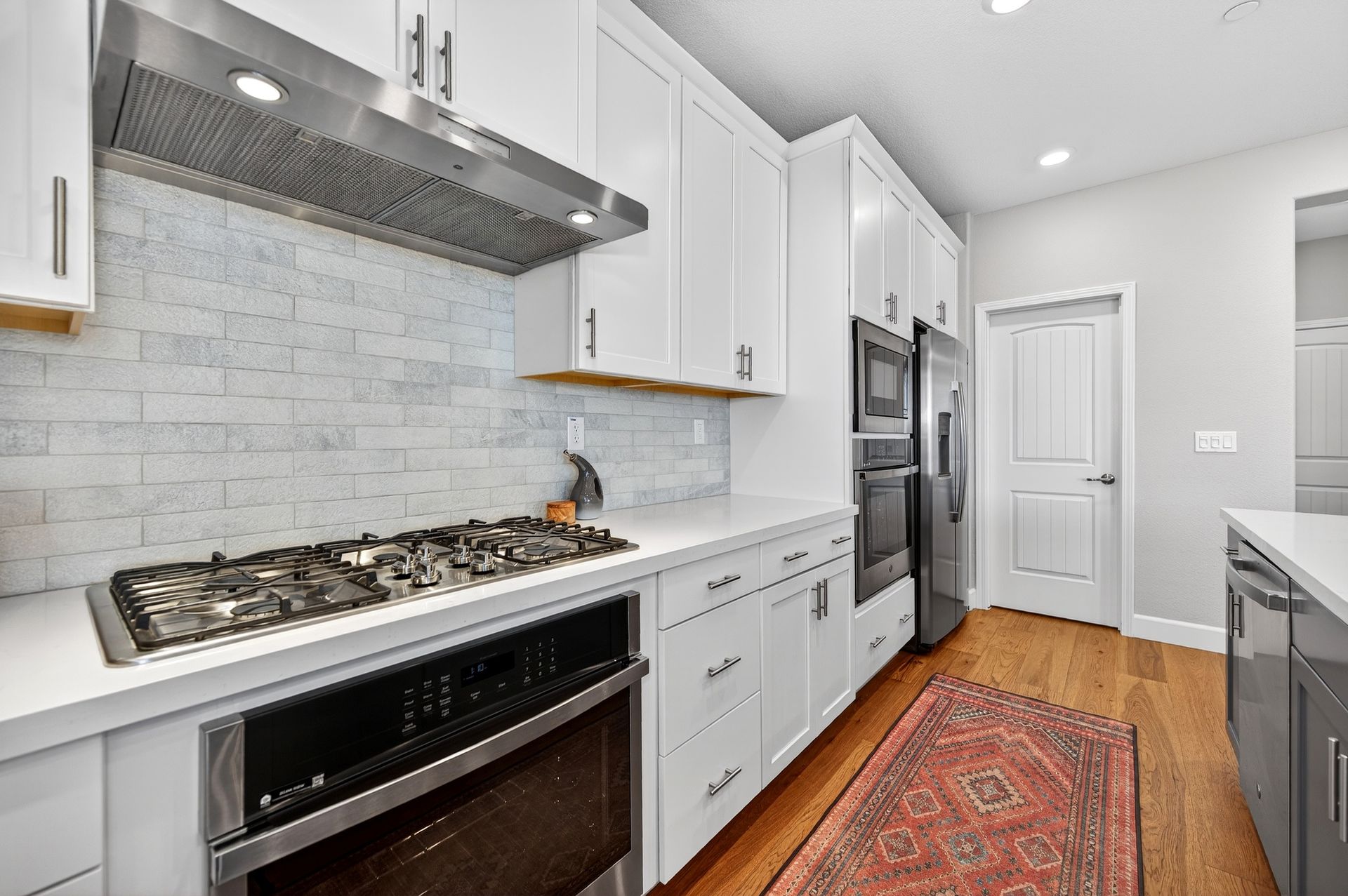Stunning kitchen with large island with counter seating, quartz countertops, pendant lighting, decorative tile backsplash, white cabinetry with decorative hardware, and roll-outs, stainless steel appliances (including two ovens and a built-in cooktop), and a walk-in pantry.