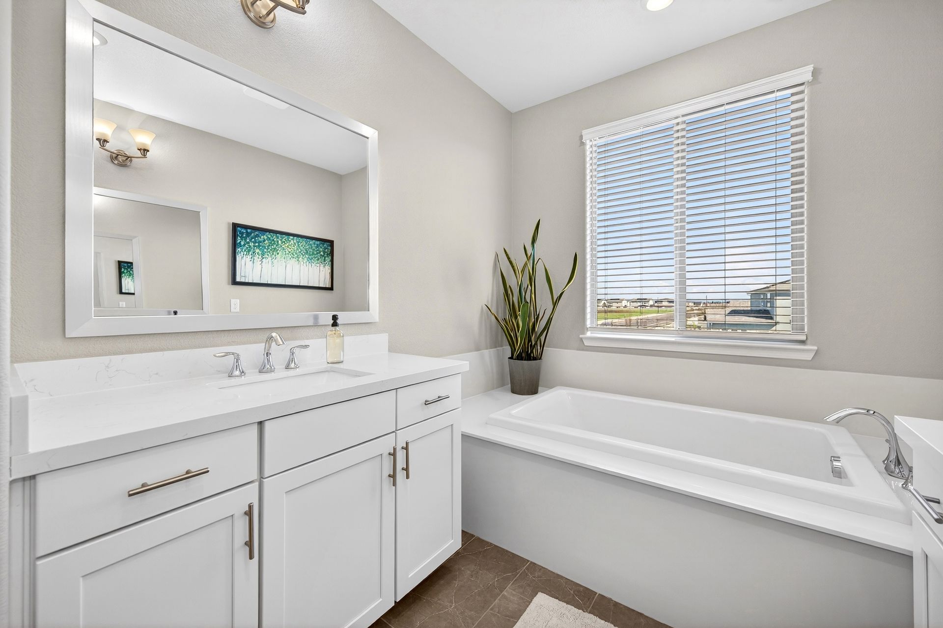 Relax from the day in the spa-like primary bath with separate vanities with framed mirrors, rectangular soaking tub, and glass enclosed shower with a bench.