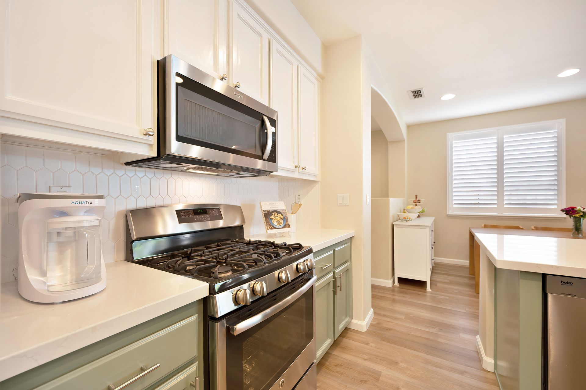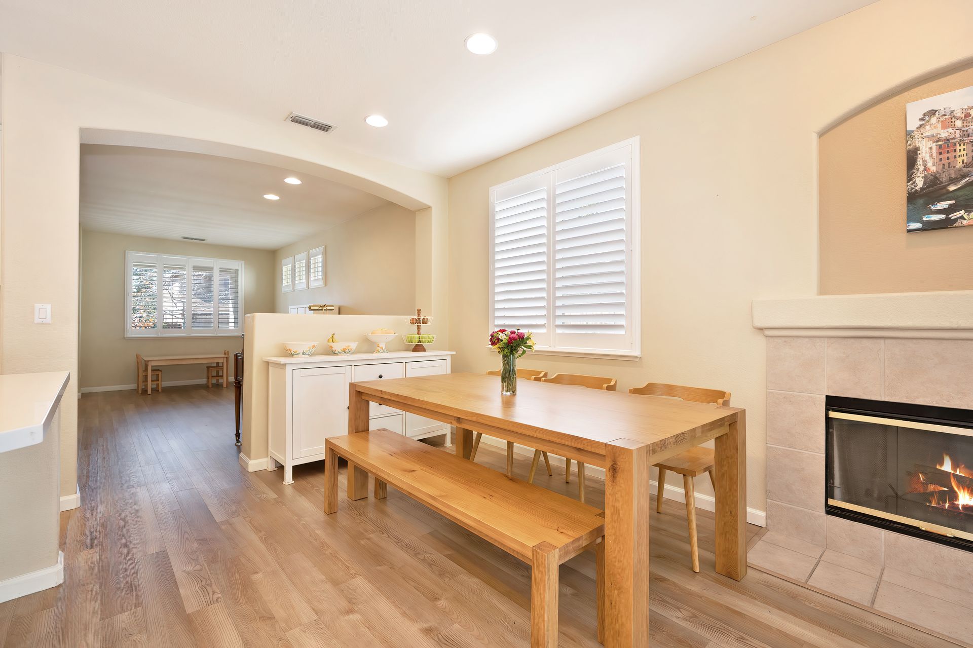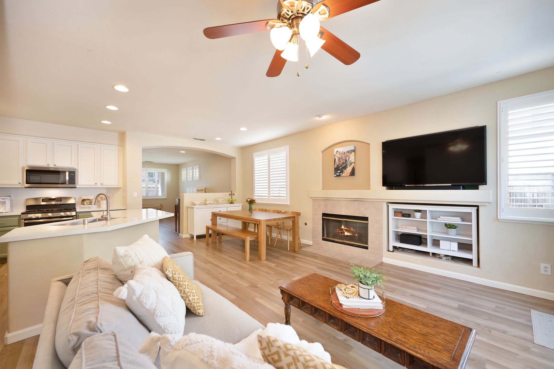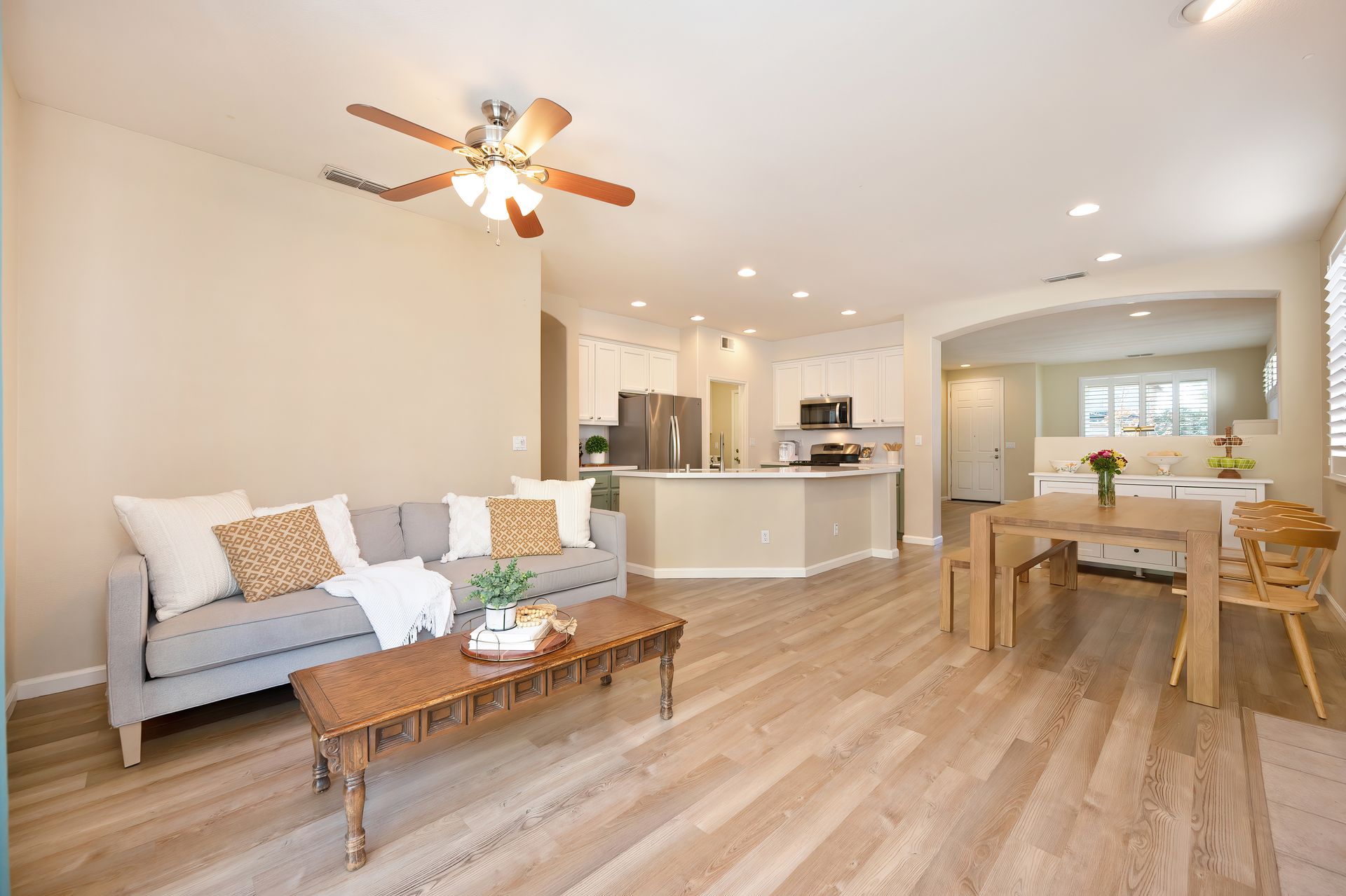 LVP flooring, recessed lighting, plantation shutters, and architectural arches.