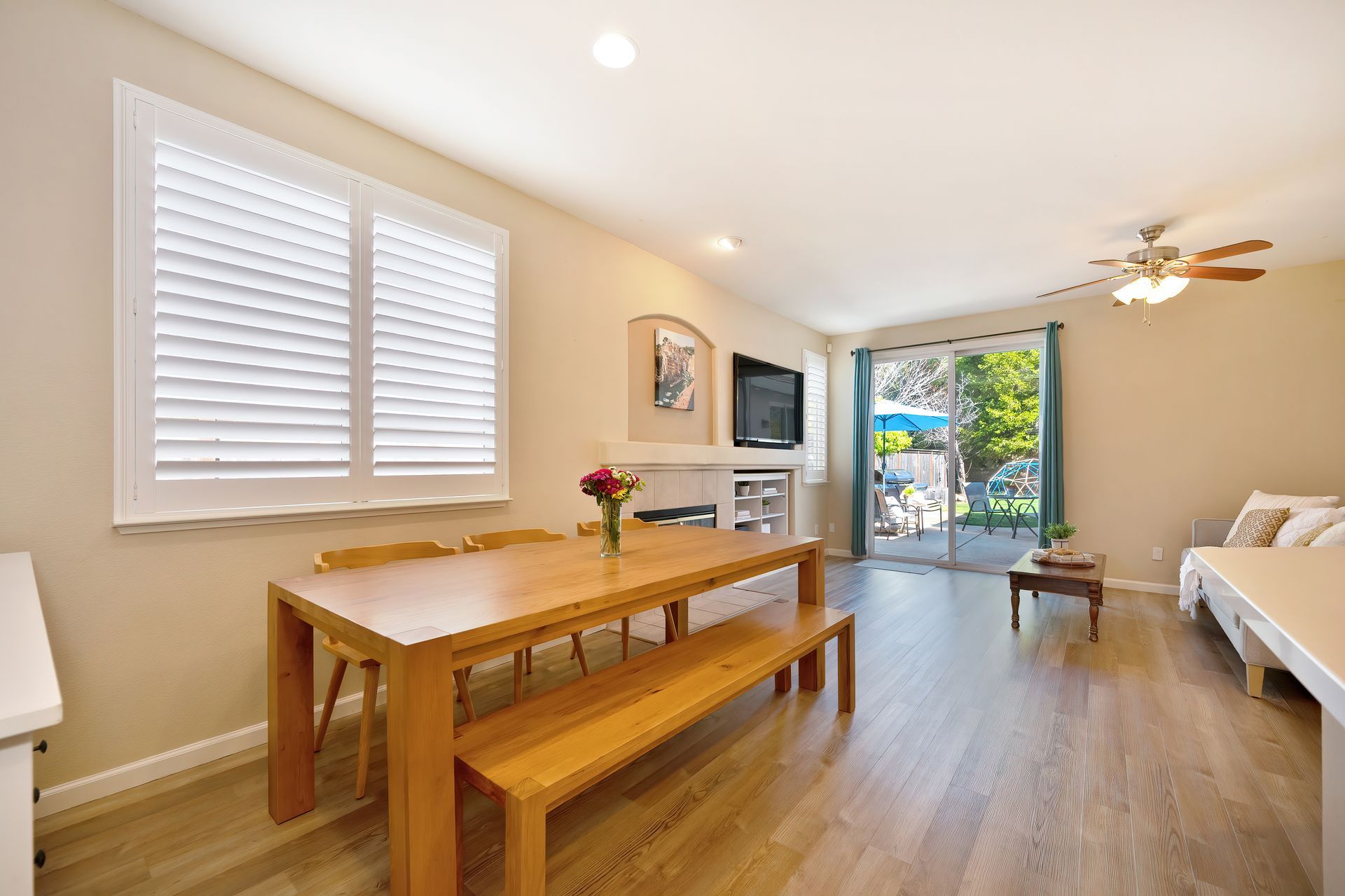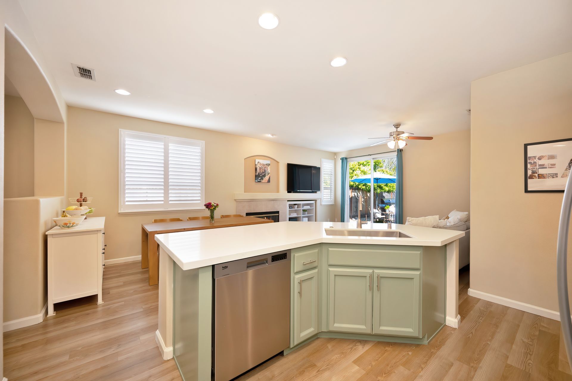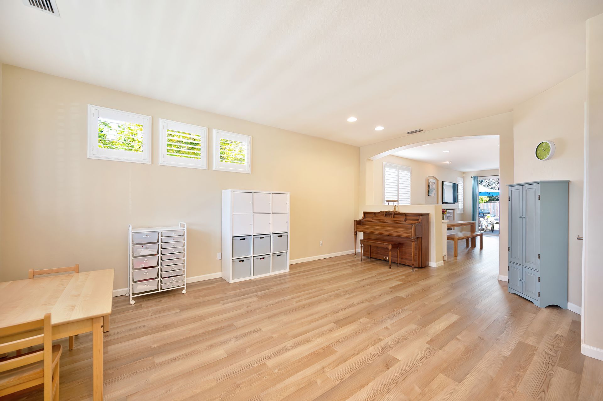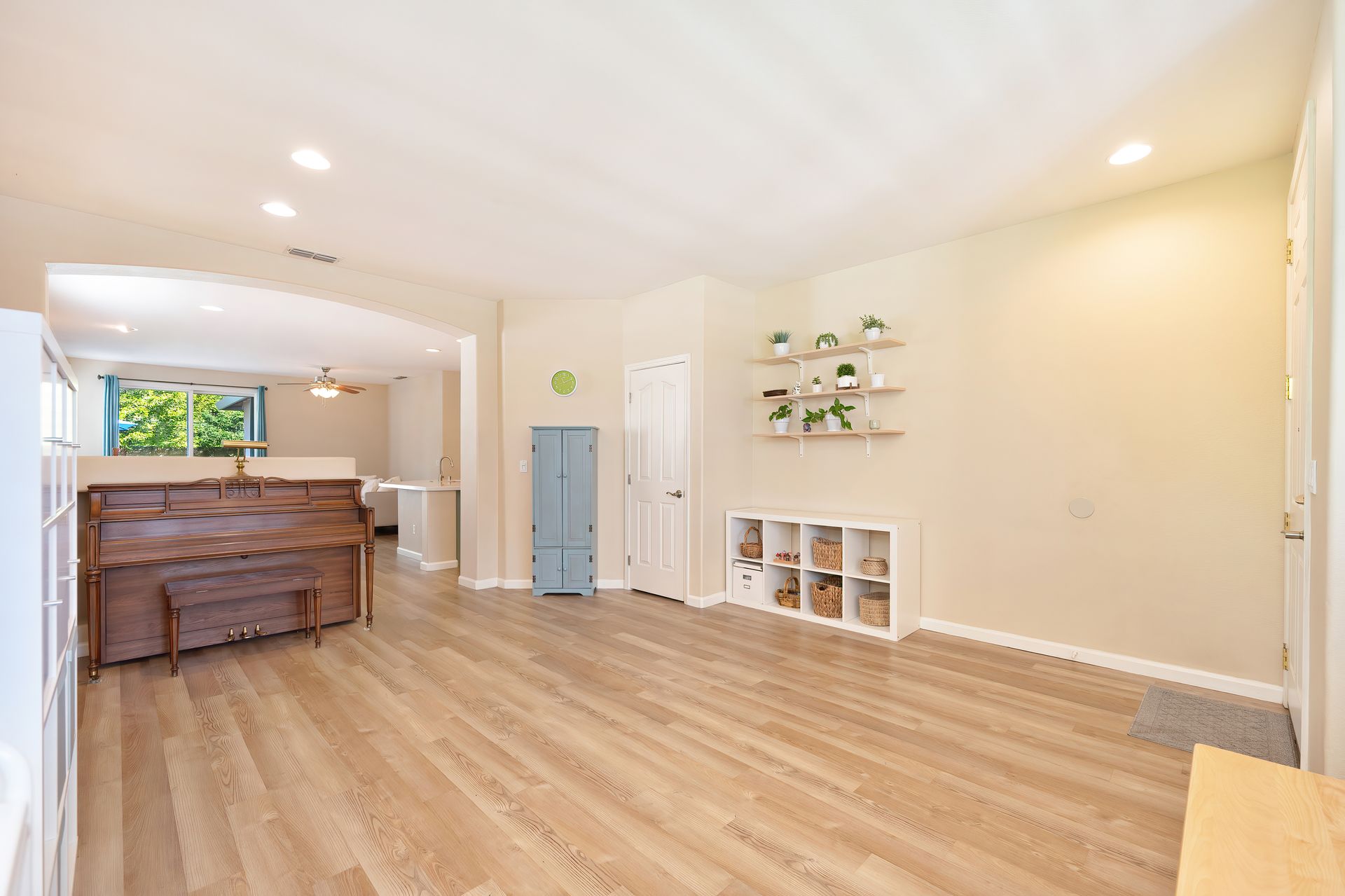 LVP flooring, recessed lighting, plantation shutters, and architectural arches.