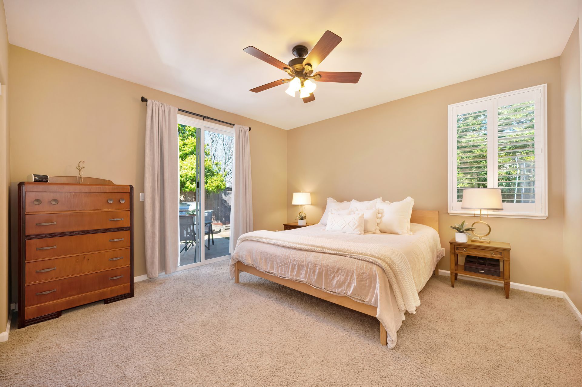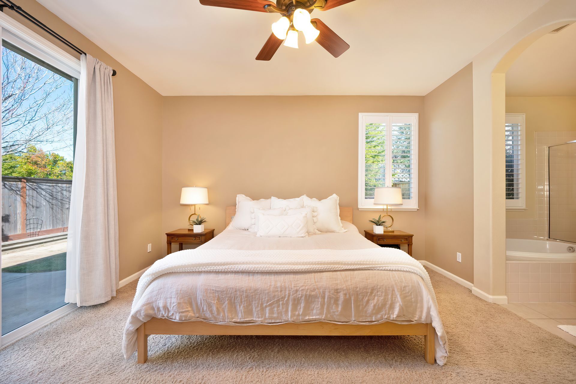 Private and spacious primary bedroom with a ceiling fan, large walk-in closet with shelving, and a sliding glass door to the backyard.