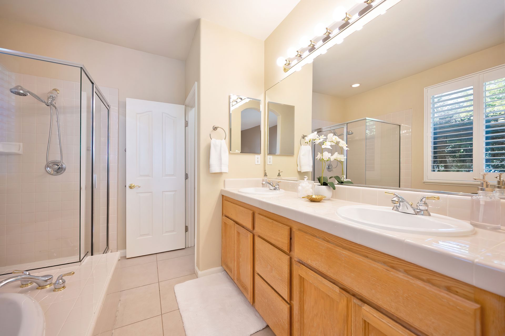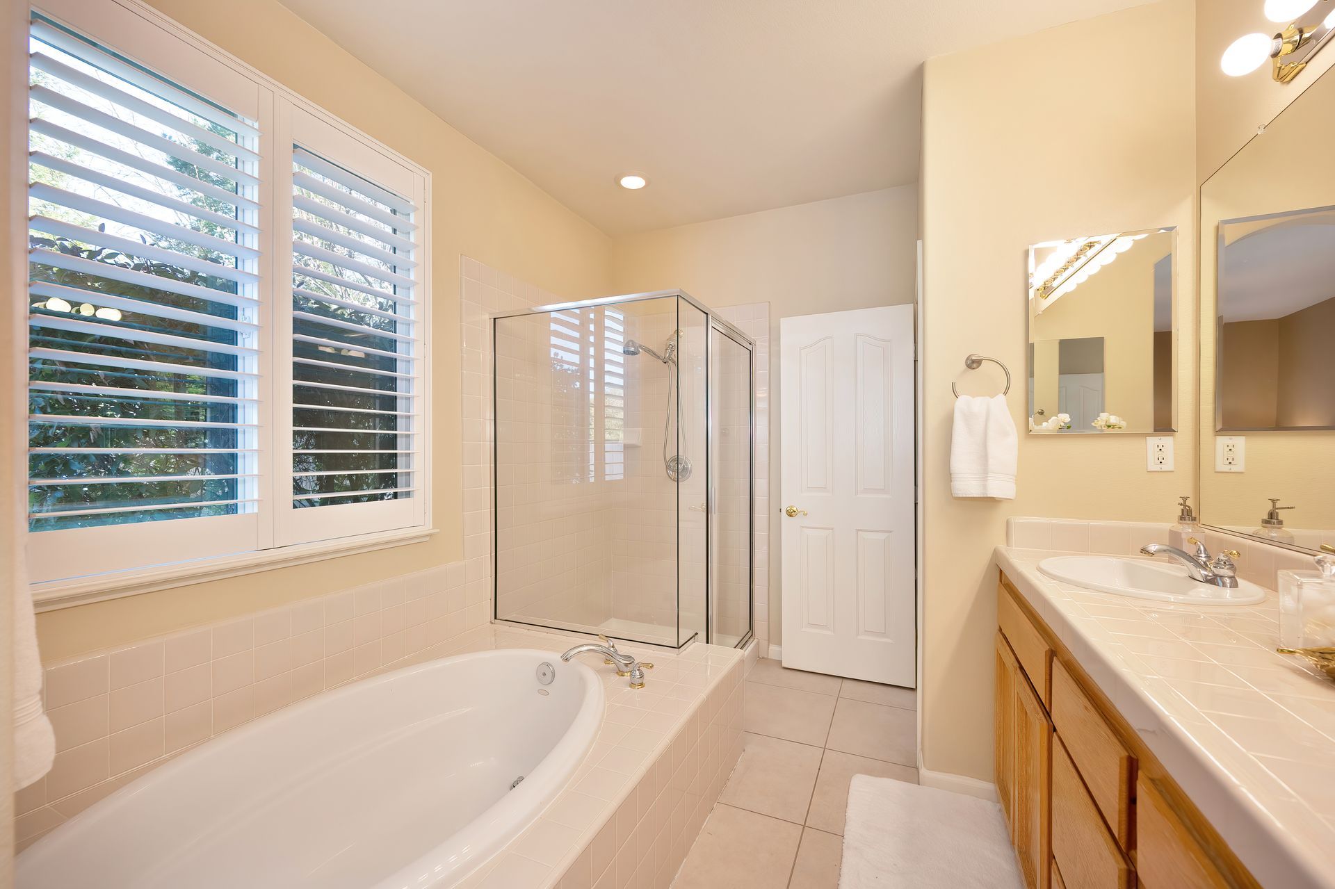 Elegant primary bathroom with a large dual sink vanity, oval soaking tub, and glass enclosed shower with a handheld showerhead.