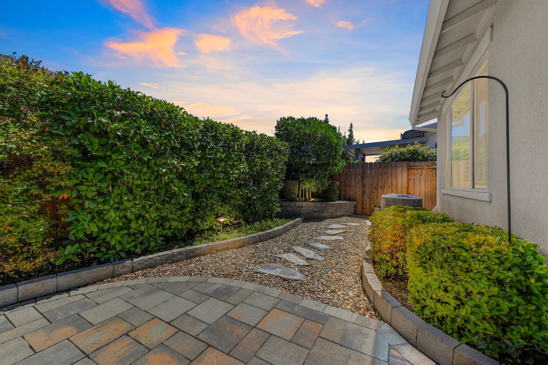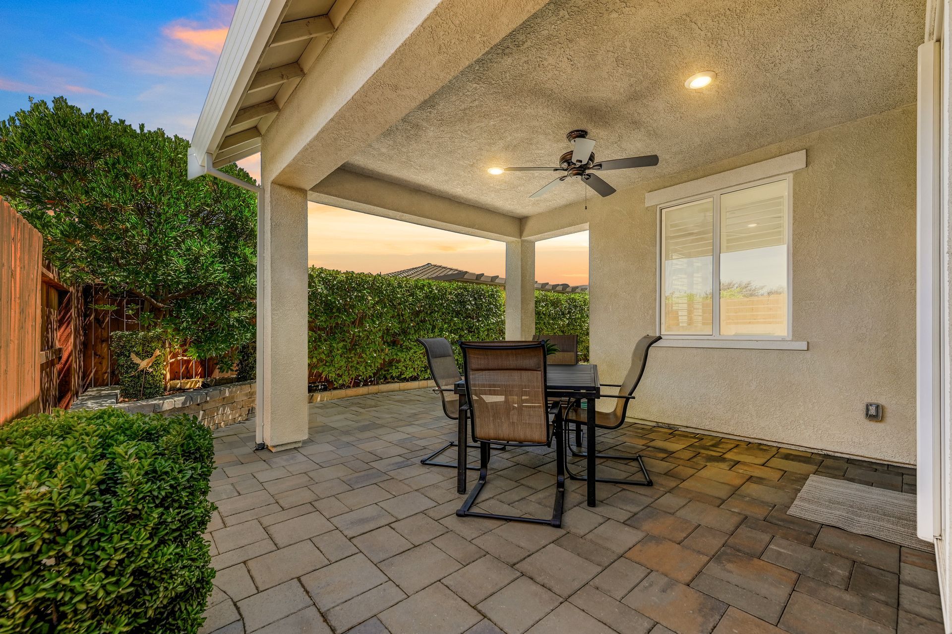 Entertain with ease in the beautifully landscaped backyard featuring a covered patio with a ceiling fan, paver hardscape, and lush mature landscaping.