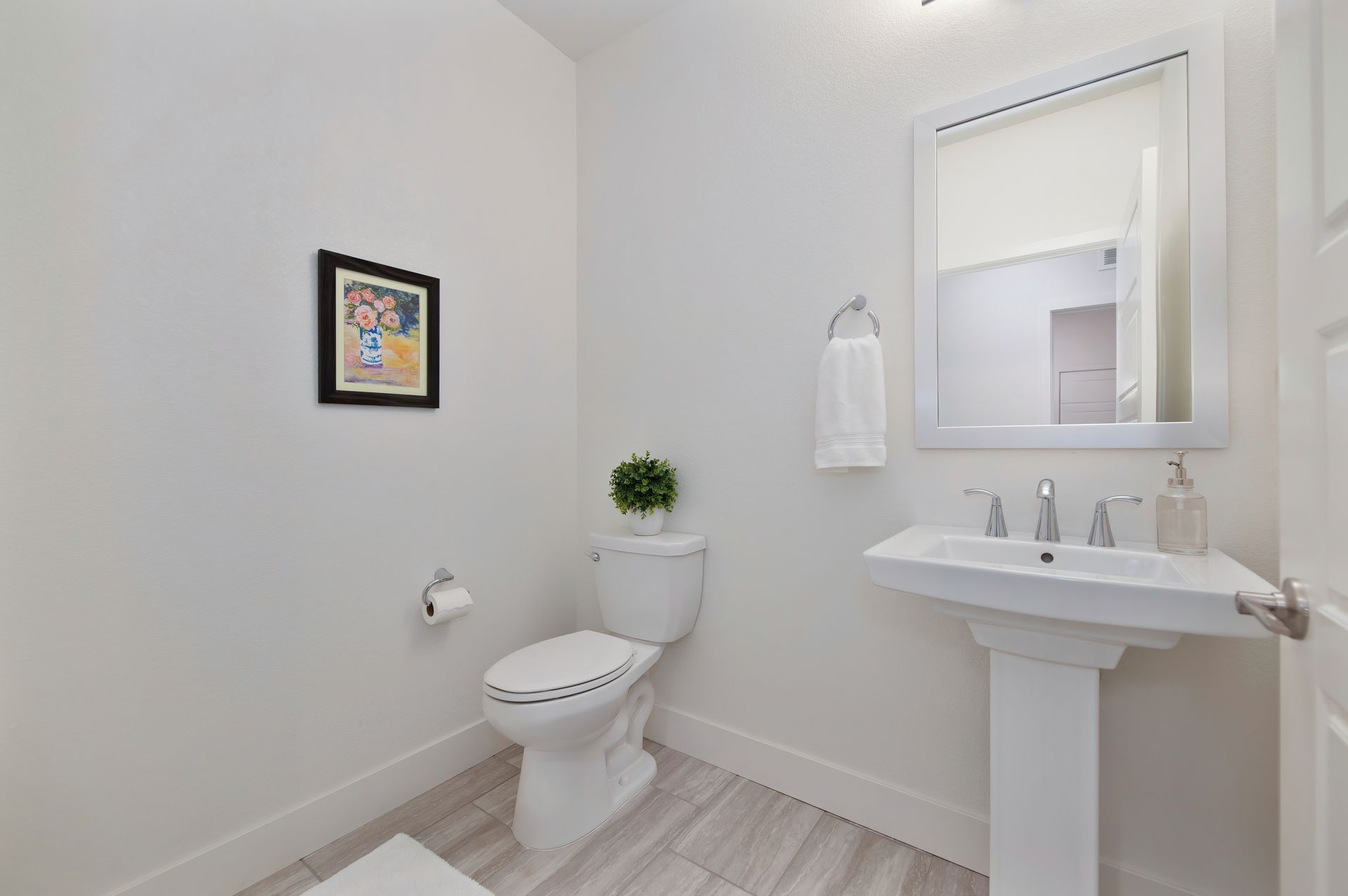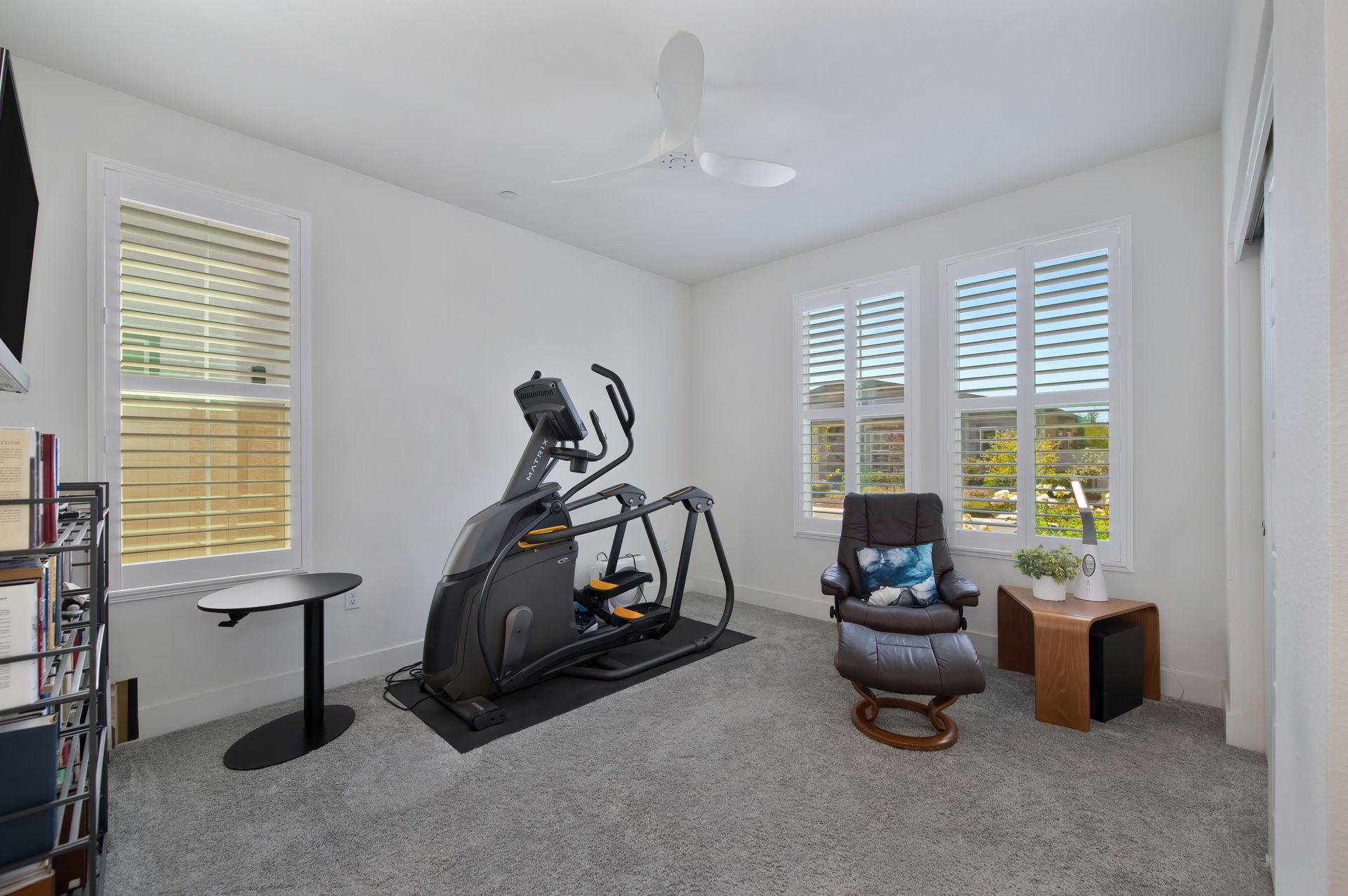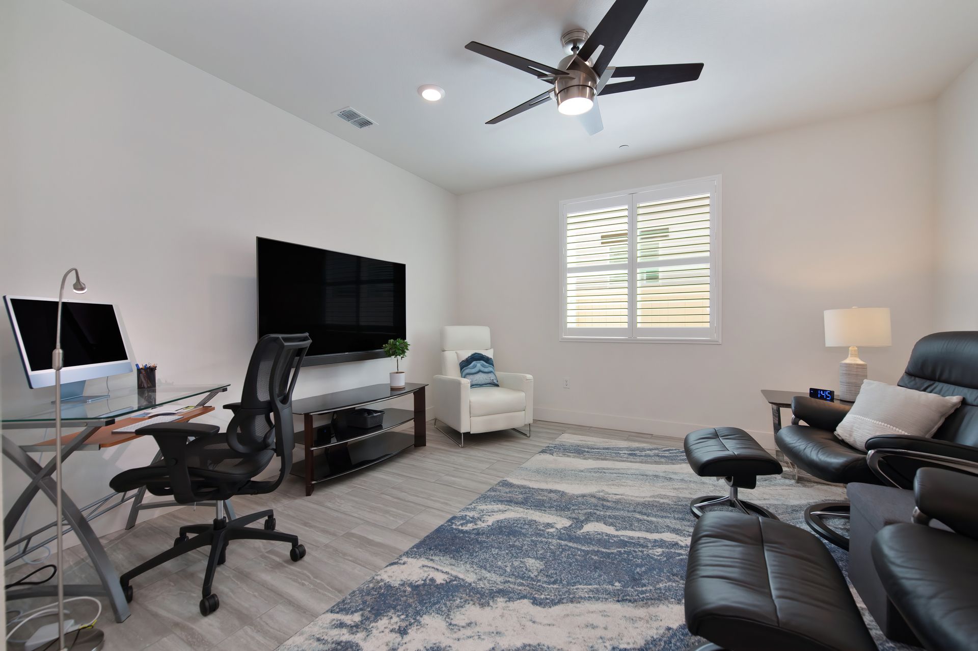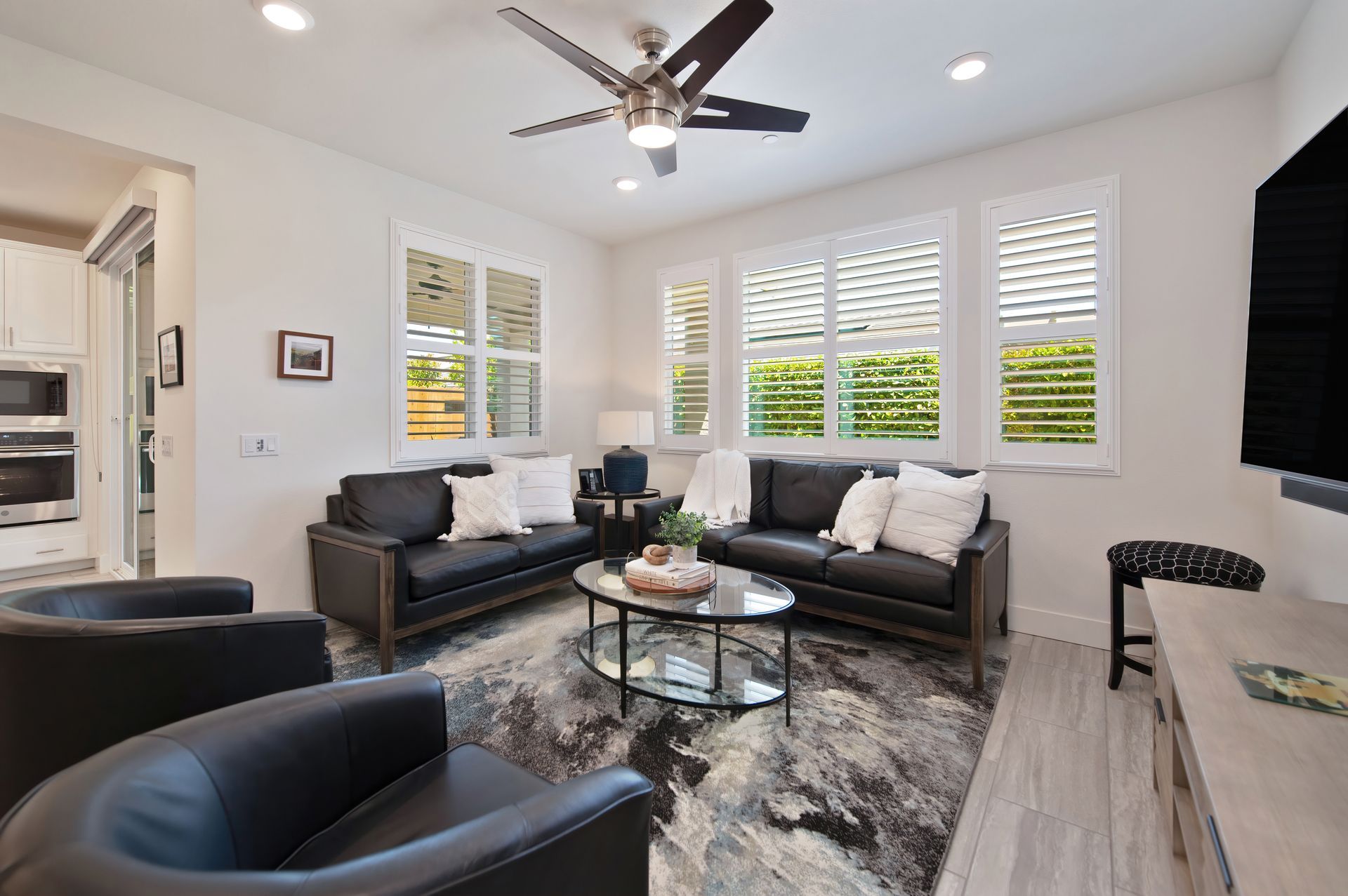 The office/den is framed with glass sliding doors, providing flexibility for work or quiet retreat, and the powder room offers convenience for visitors.