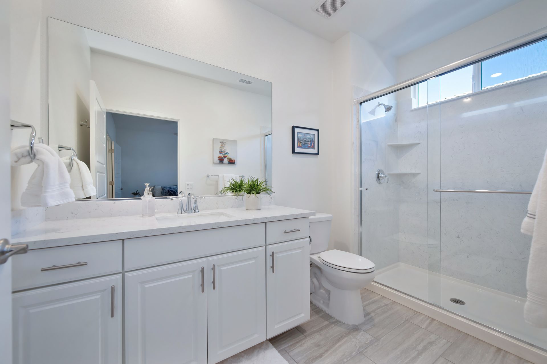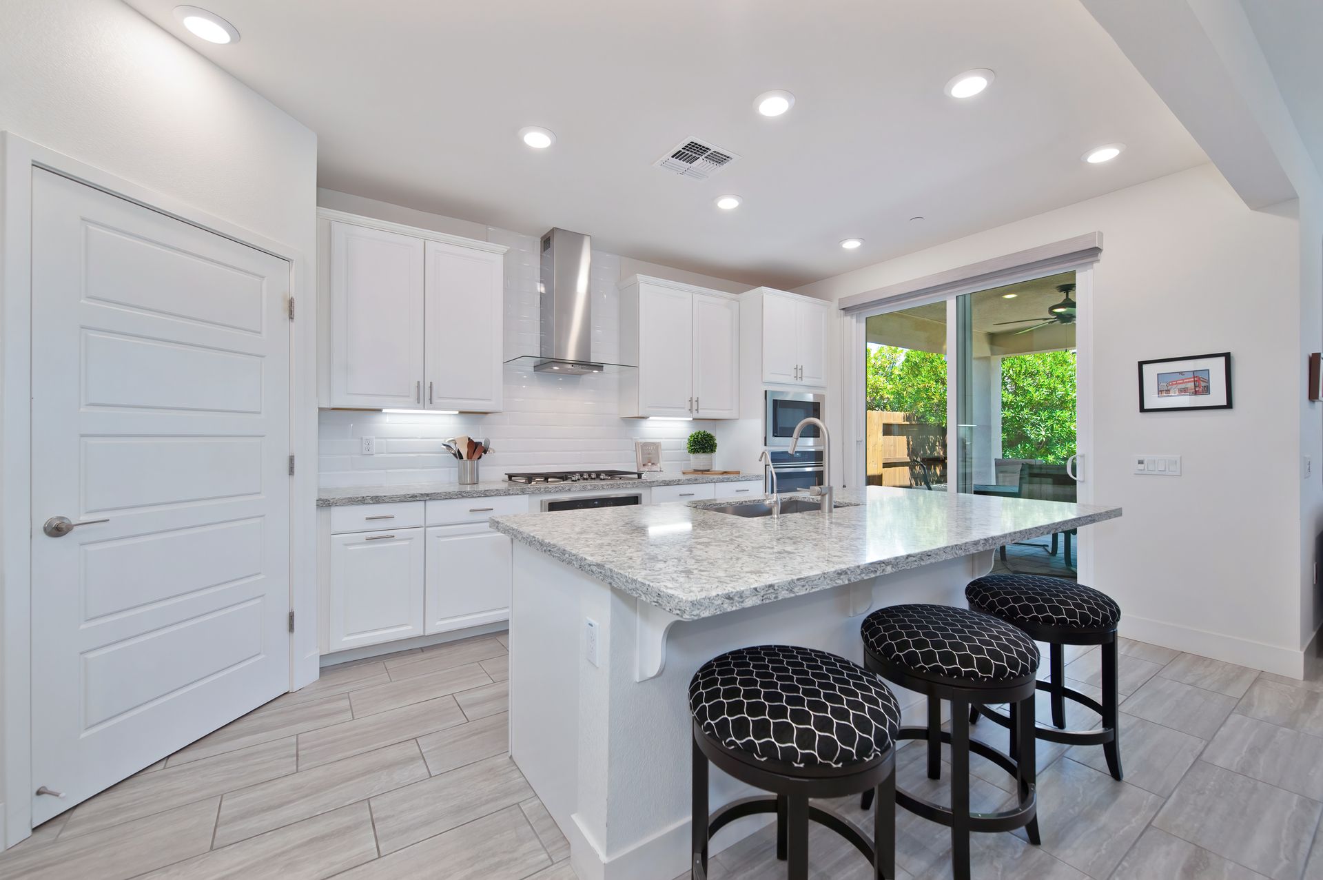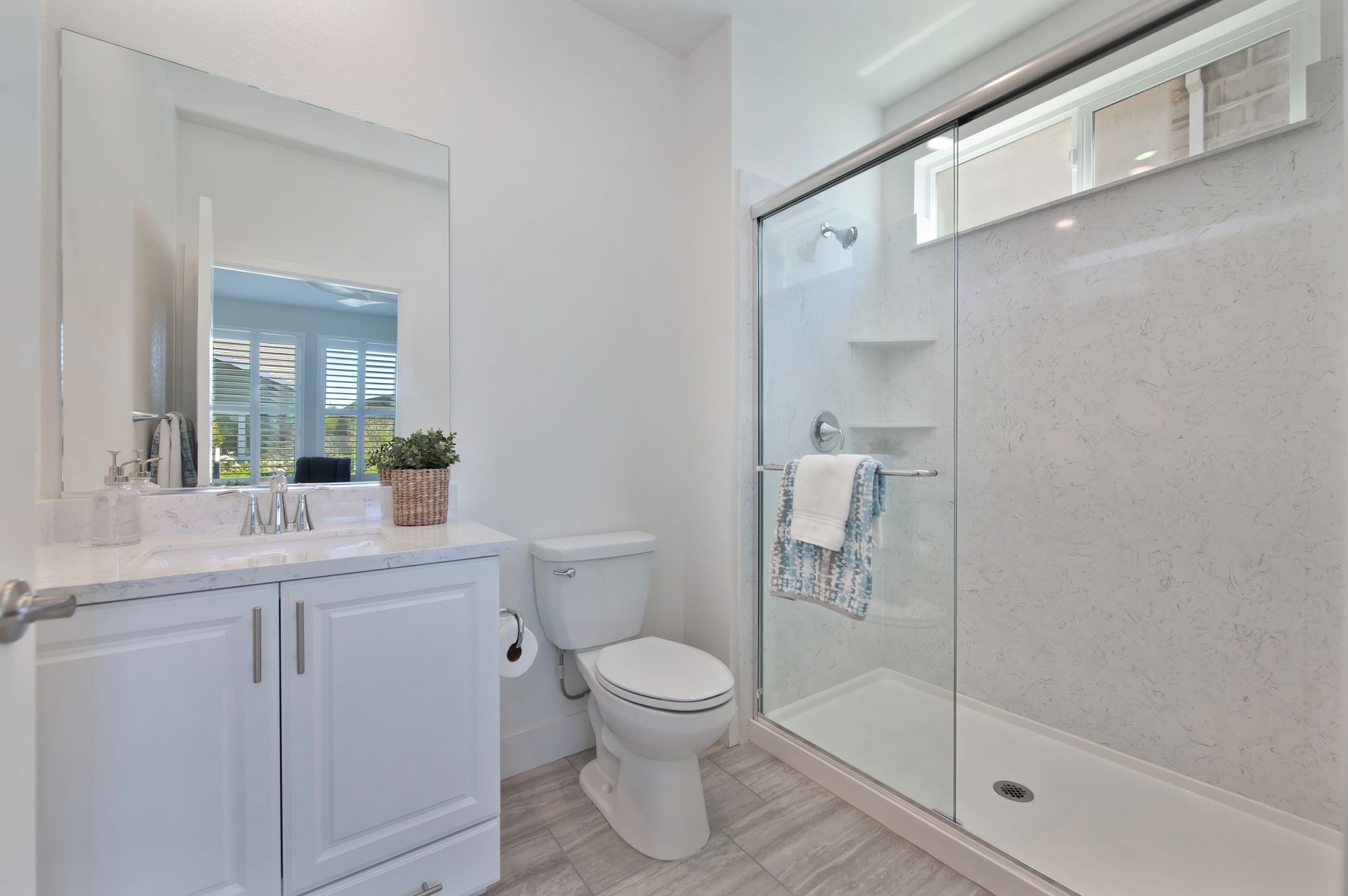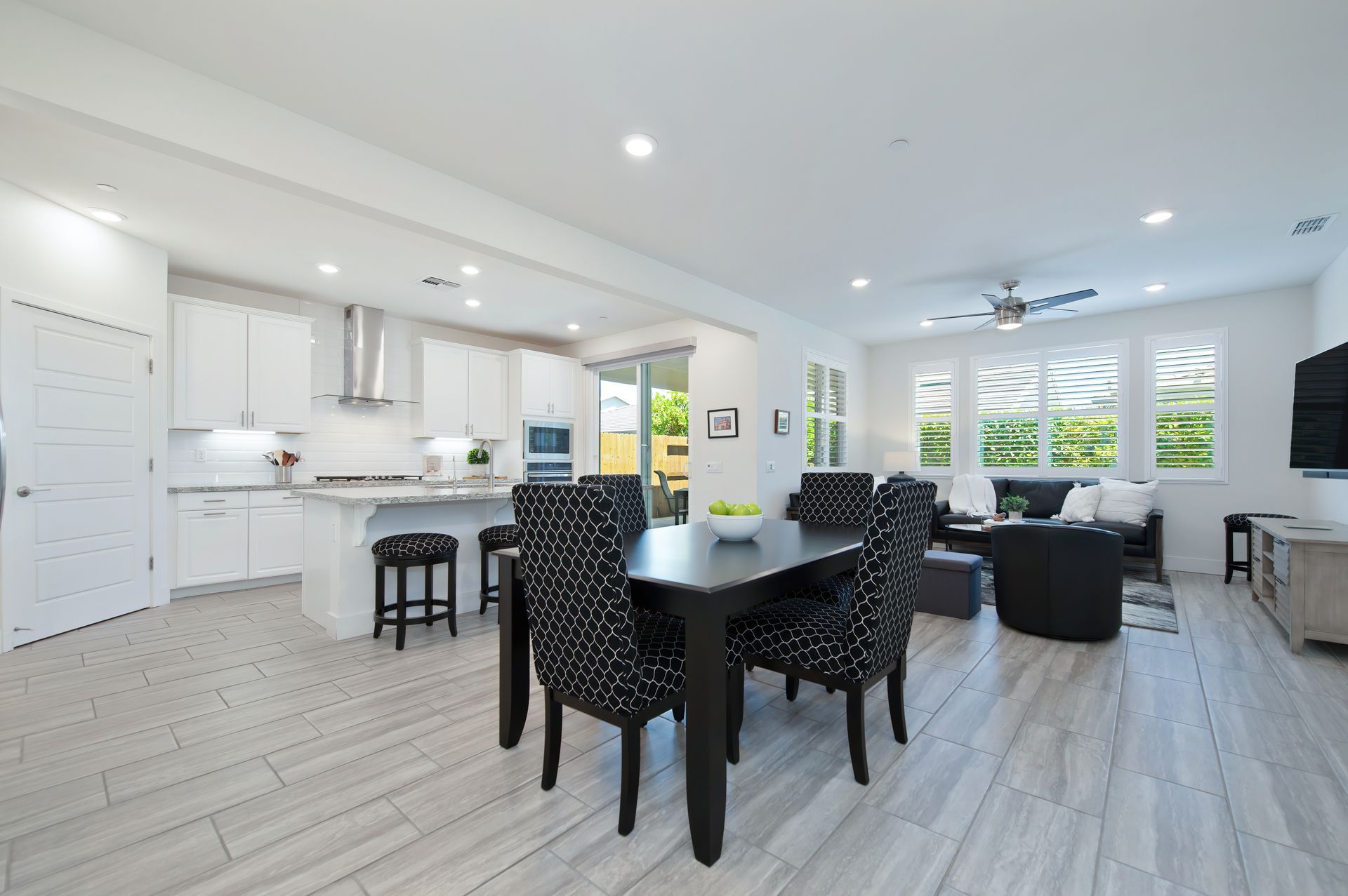 Inside, the elegance continues with 9 foot ceilings, 12” x 24” tile flooring, plantation shutters, recessed lighting, upgraded ceiling fans, 5 panel craftsman style doors, and 5¼ inch baseboards throughout.