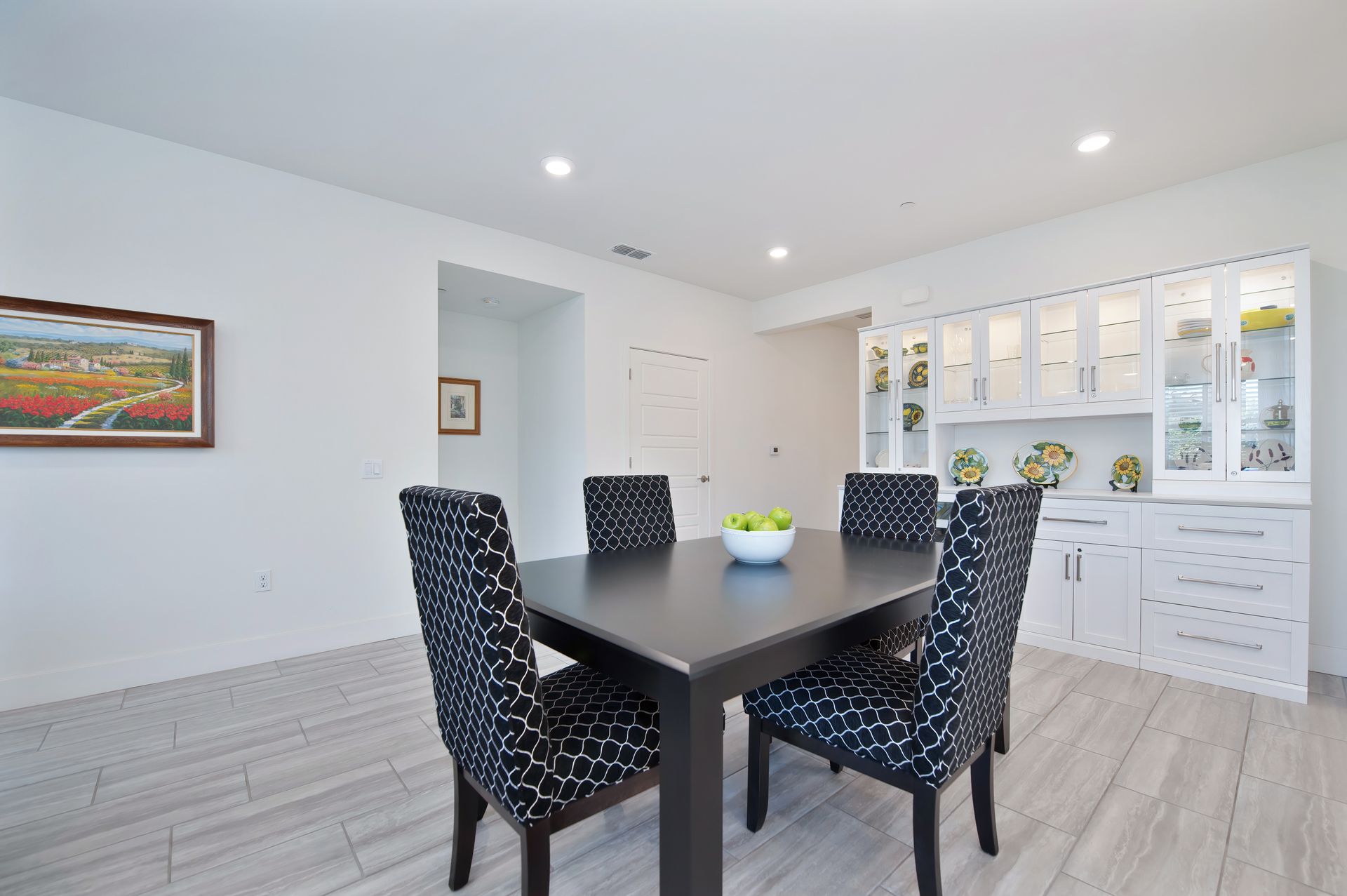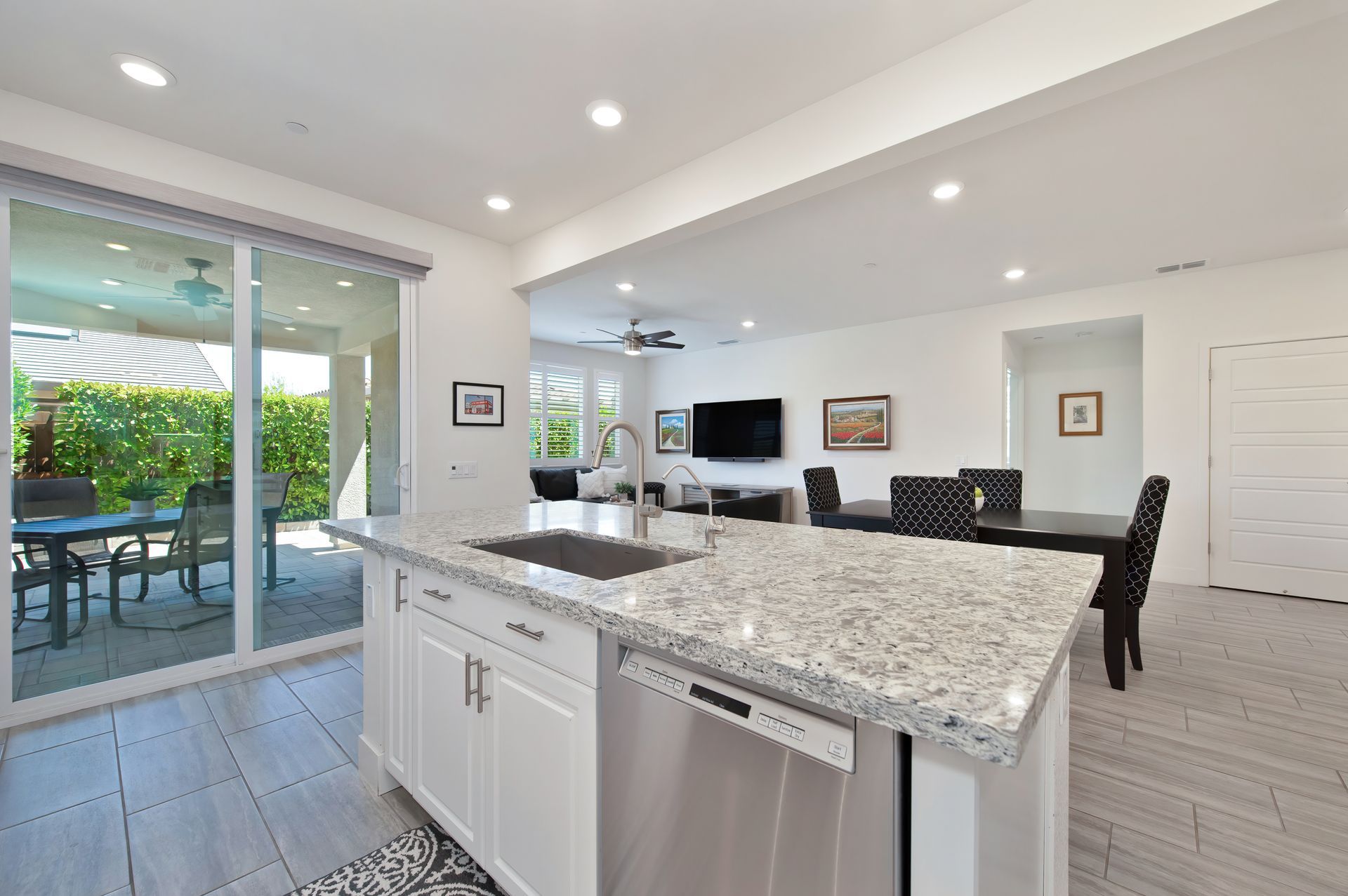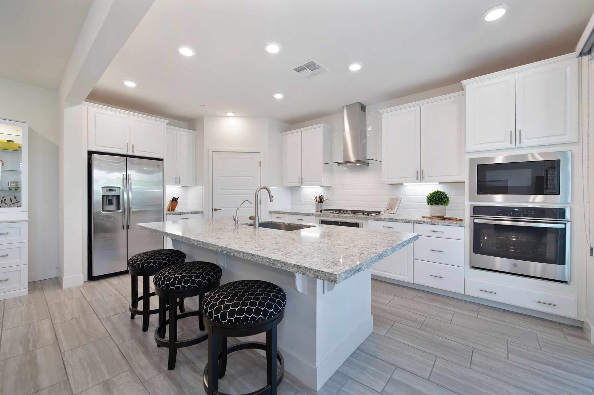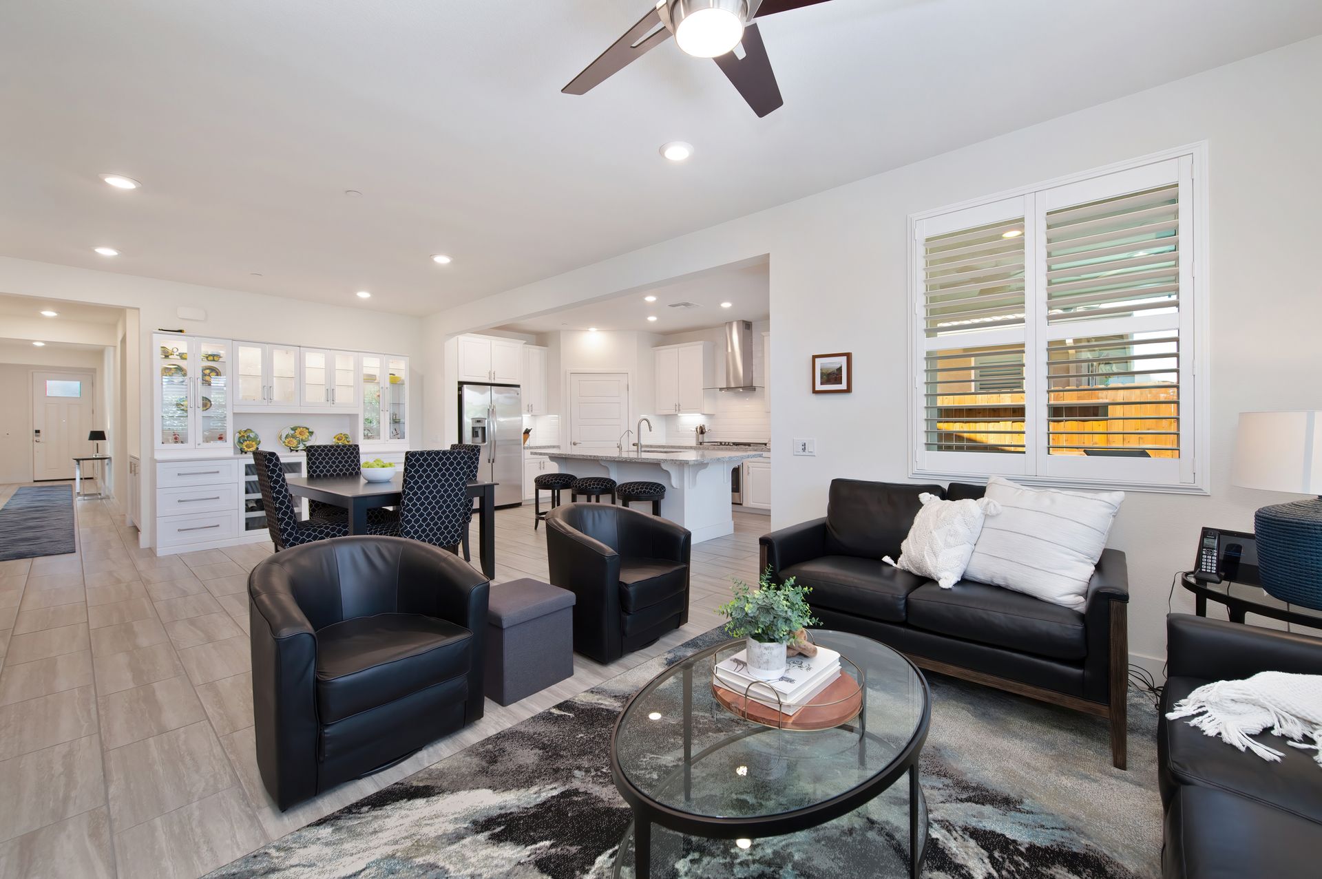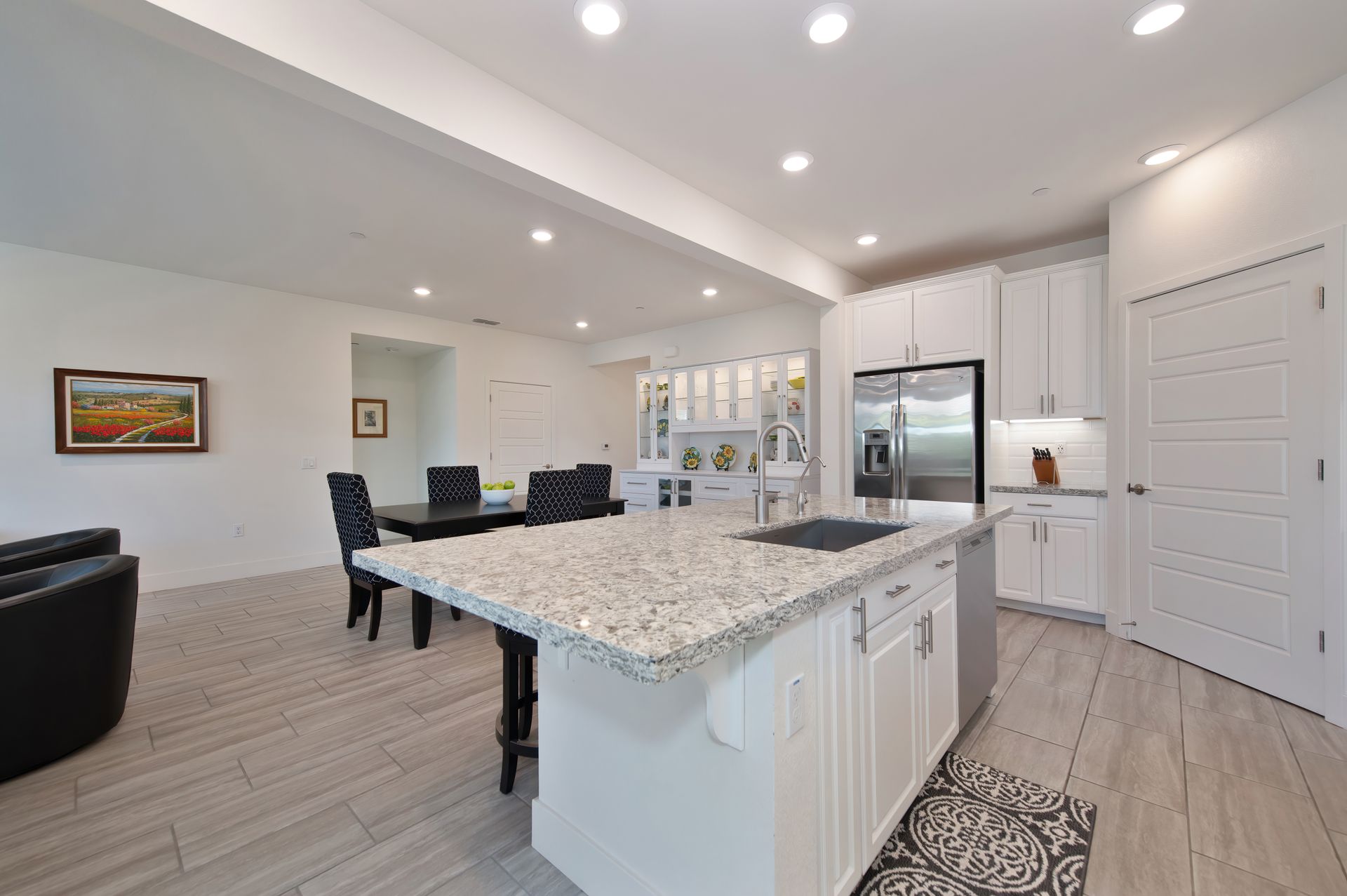 The open concept great room creates an ideal space for entertaining or everyday comfort, with a welcoming gathering area, a dining space anchored by a stunning buffet with glass front lit cabinetry, and a chef’s dream kitchen.