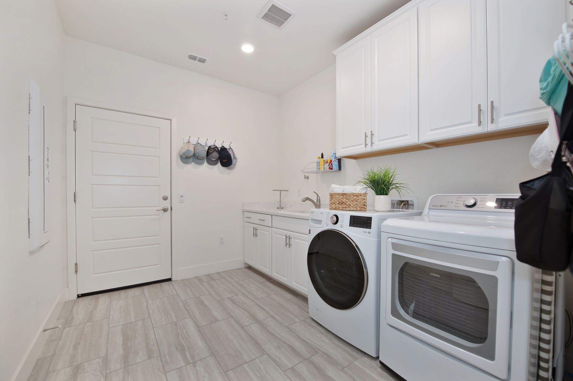 Well appointed laundry room with a sink and cabinetry, along with extra storage via linen cabinetry and a coat closet.