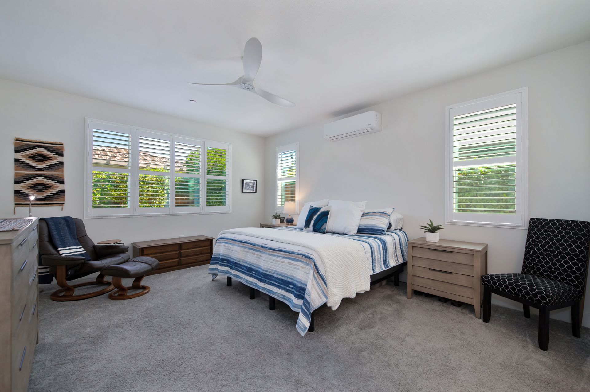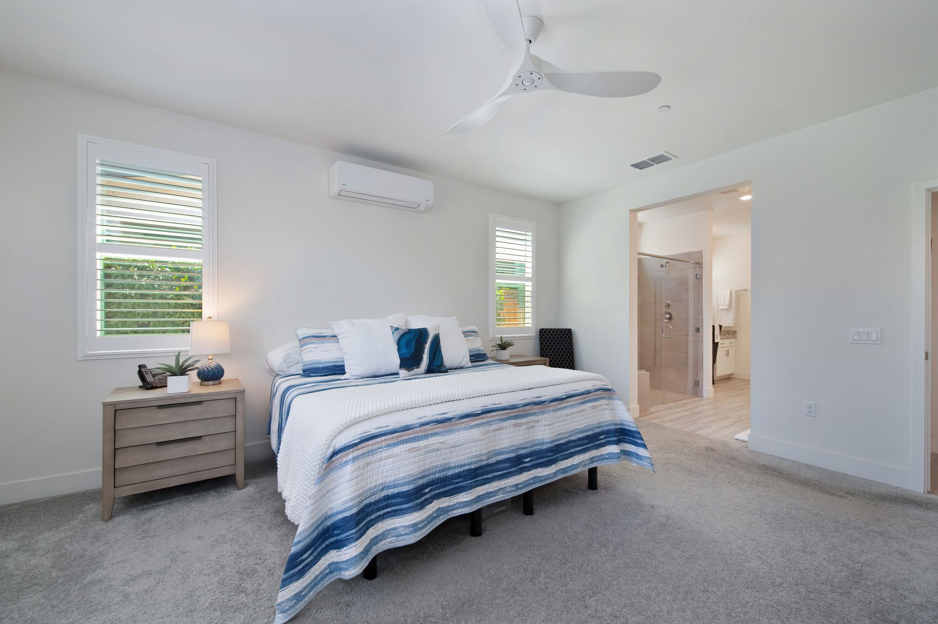 The primary suite is a luxurious private retreat, complete with its own ductless A/C unit, space for a cozy sitting area, a large walk-in closet with built-in shelving, and a spa-like bathroom.