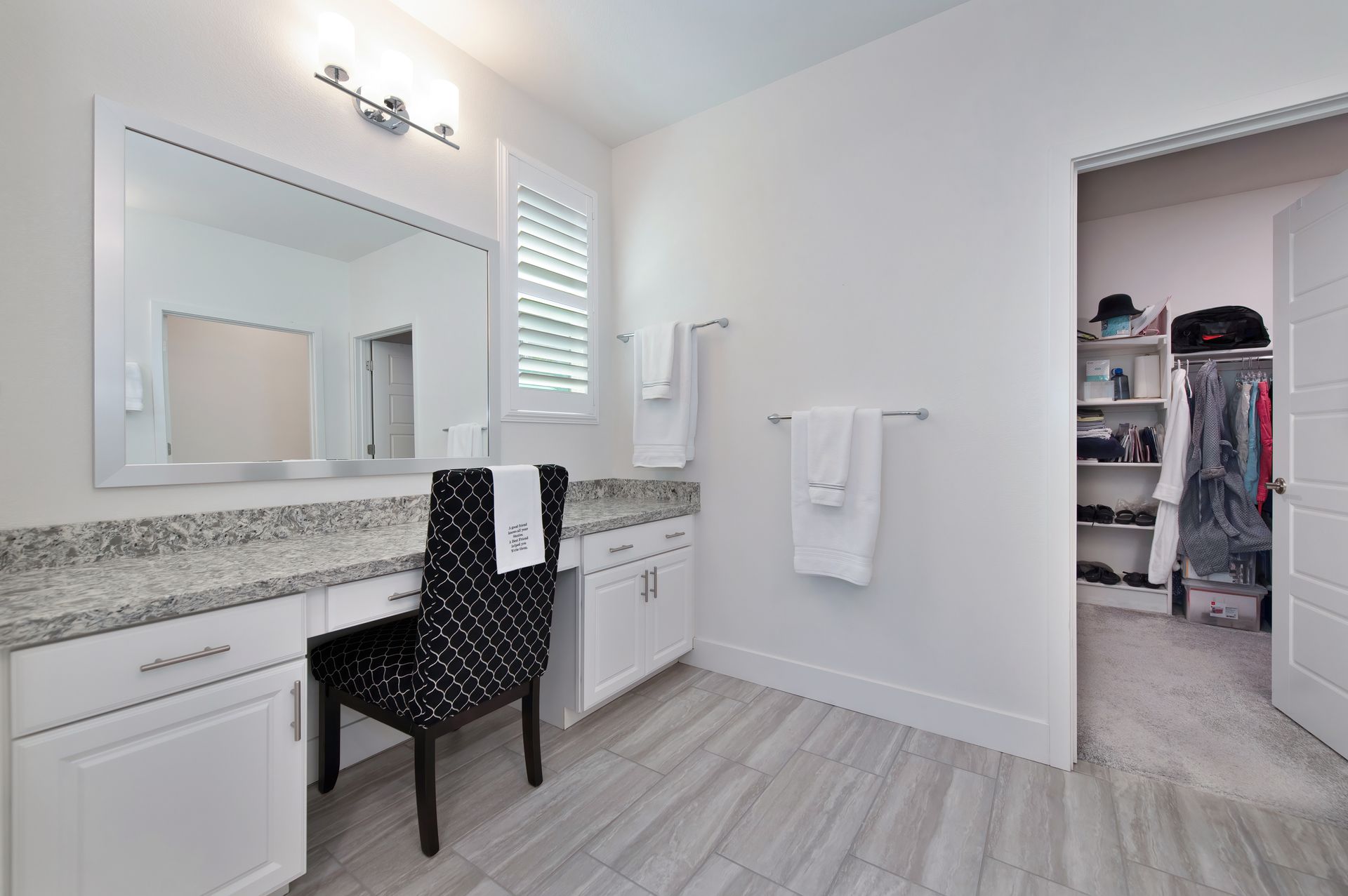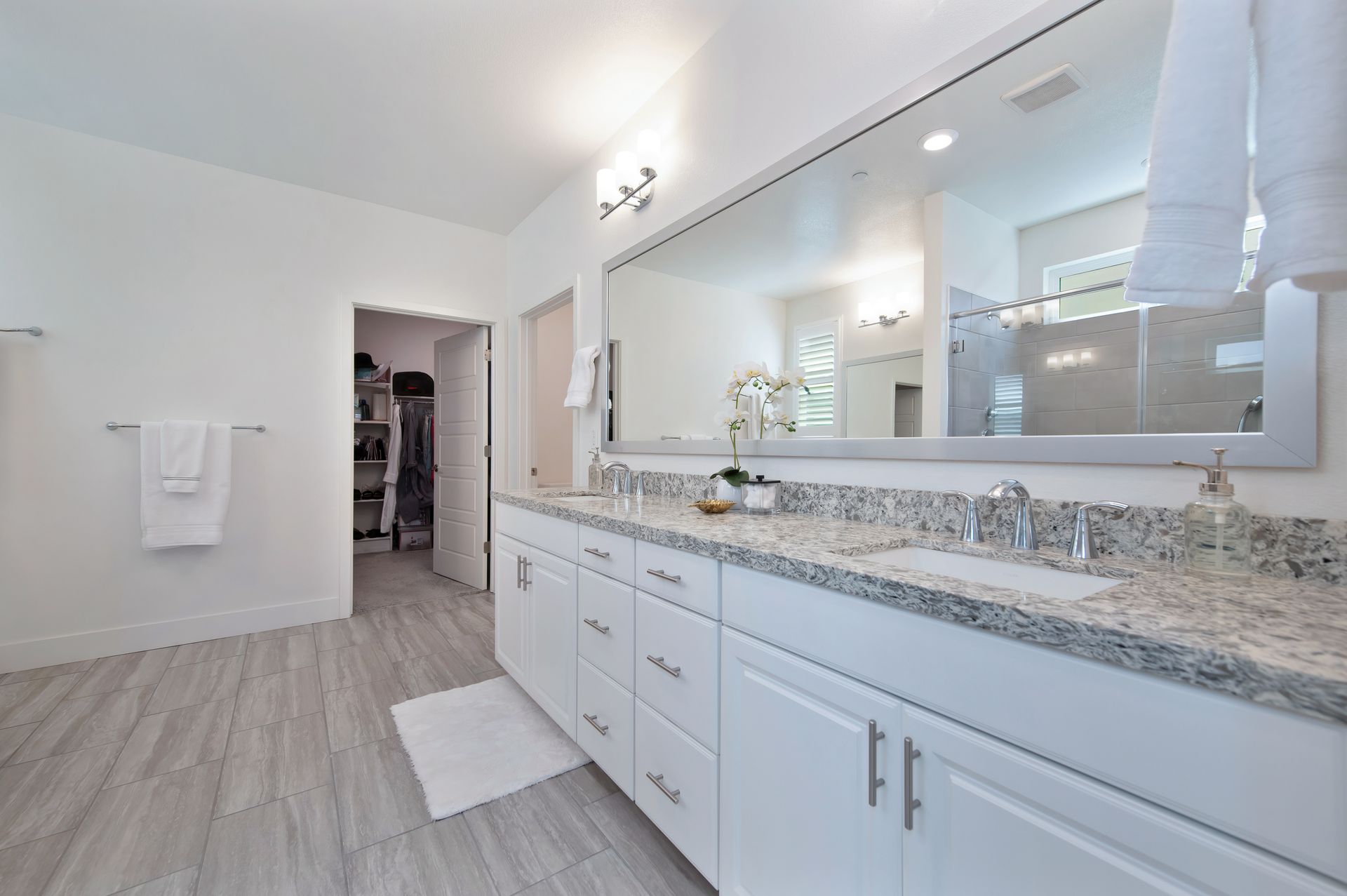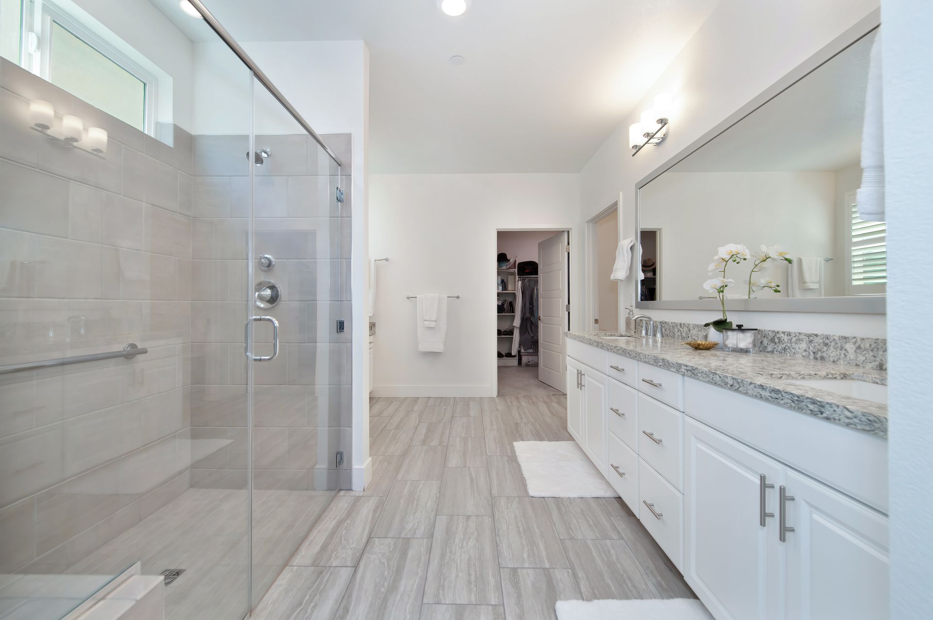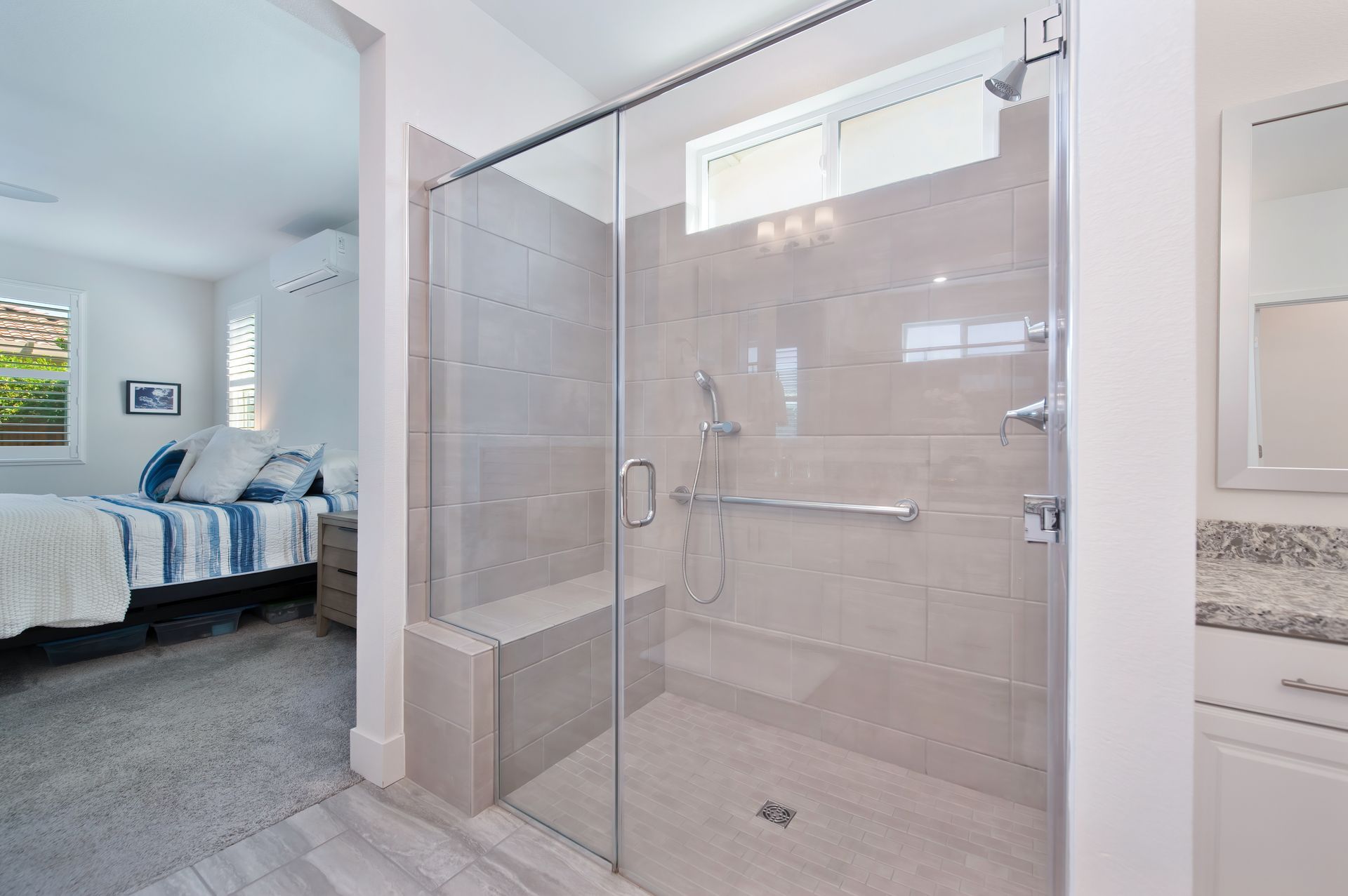 The en suite bath boasts a dual sink quartz vanity, framed mirrors, a makeup vanity, and a zero-threshold glass enclosed shower with tile surround, bench, handheld showerhead, and assist bar.
