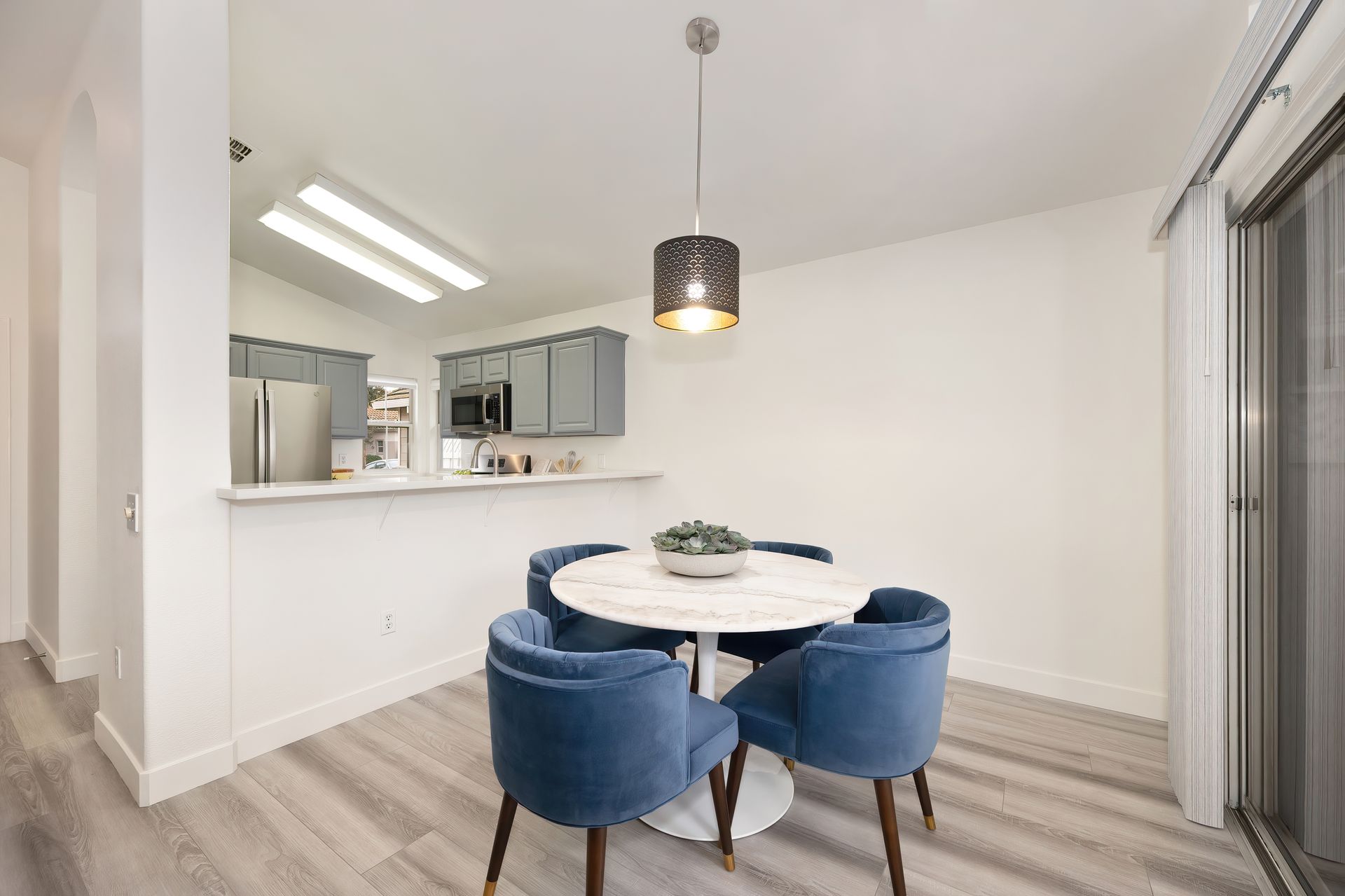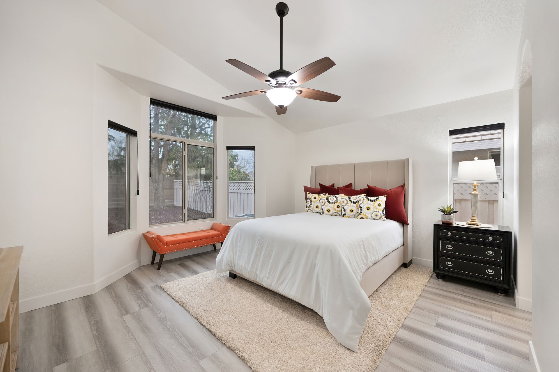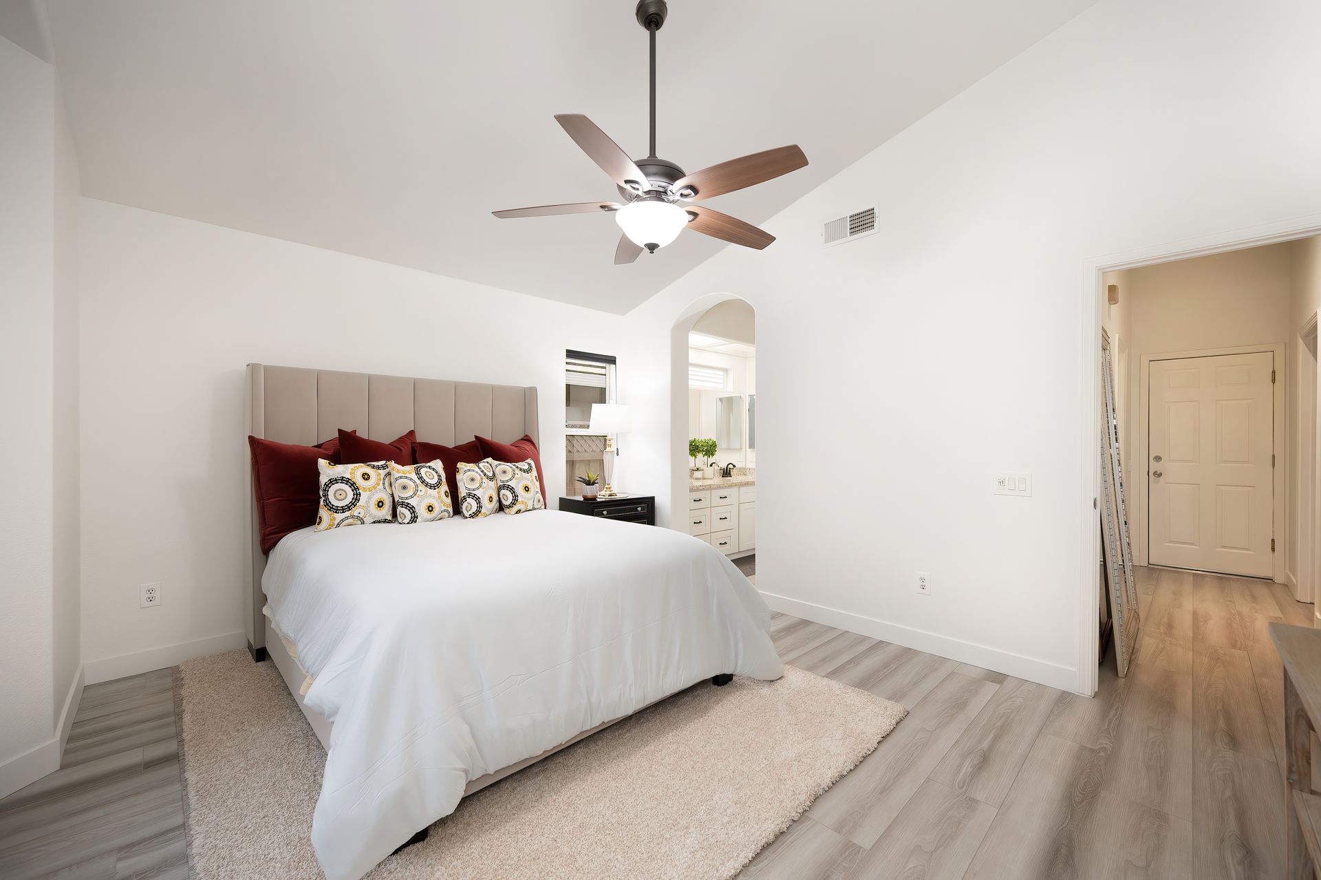 Vaulted ceilings, new LVP flooring, new interior paint, ceiling fans, 5 ¼” baseboards, Hunter Douglas pull cord window coverings, recessed lighting, and architectural arches.