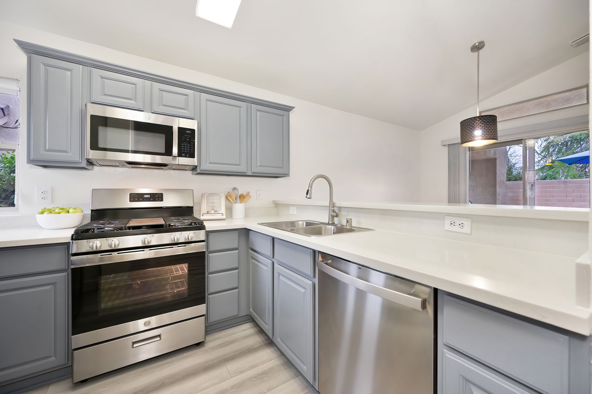 Stunning kitchen with quartz counters, counter seating, stainless steel appliances, and newly painted cabinets with roll-outs.
