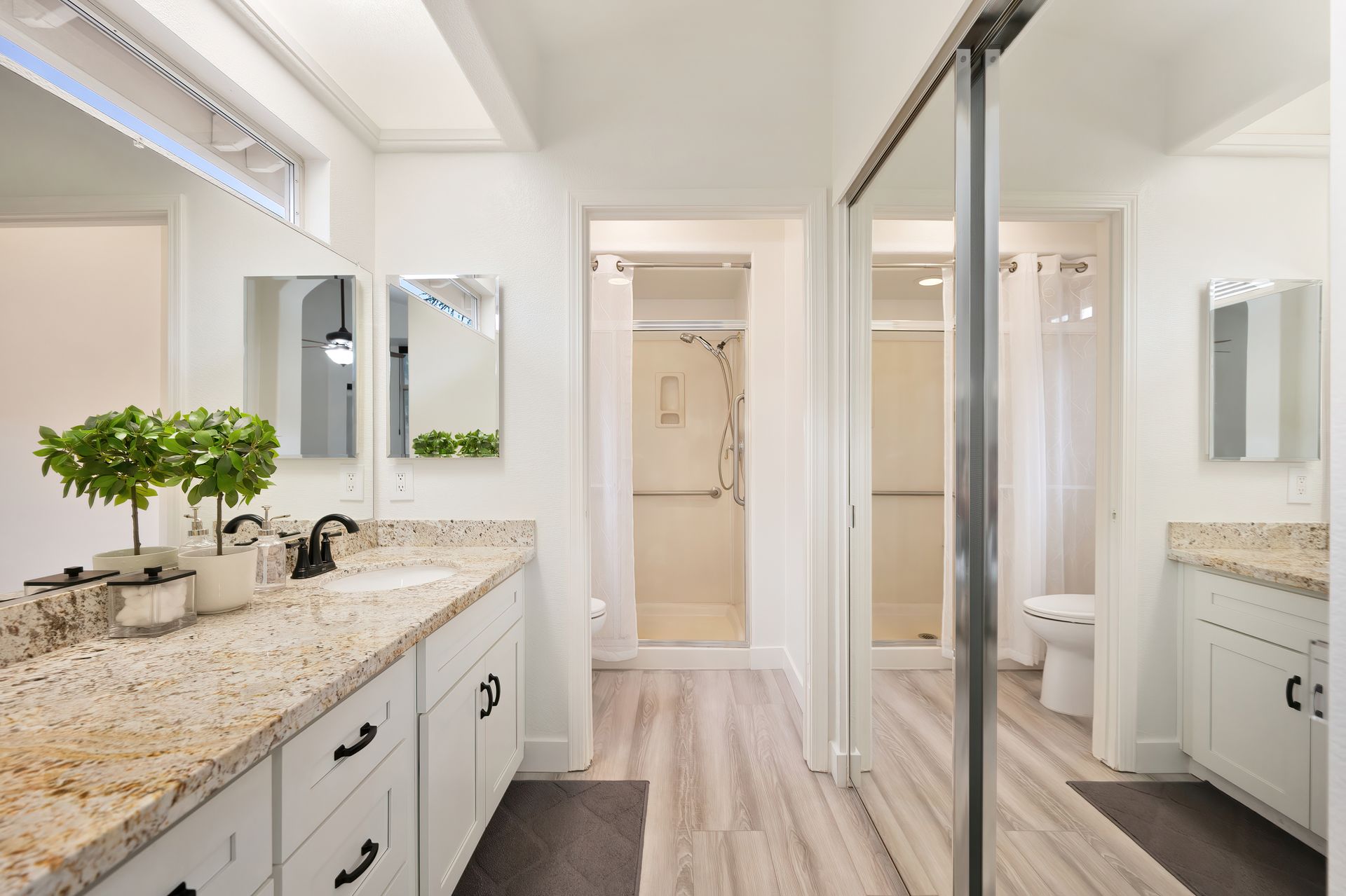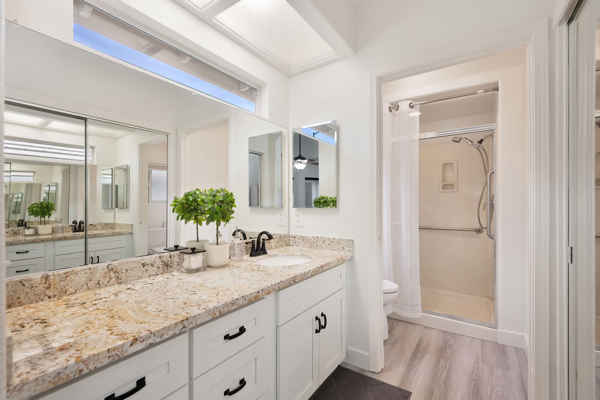 Elegant primary bath with granite countertops, white cabinetry with soft close and decorative hardware, a shower with a glass door, handheld showerhead, assist bar, and seat.