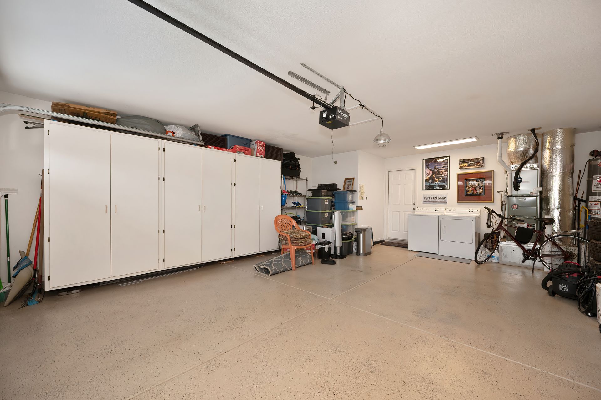 Pristine garage with laundry, epoxy flooring, and cabinetry.