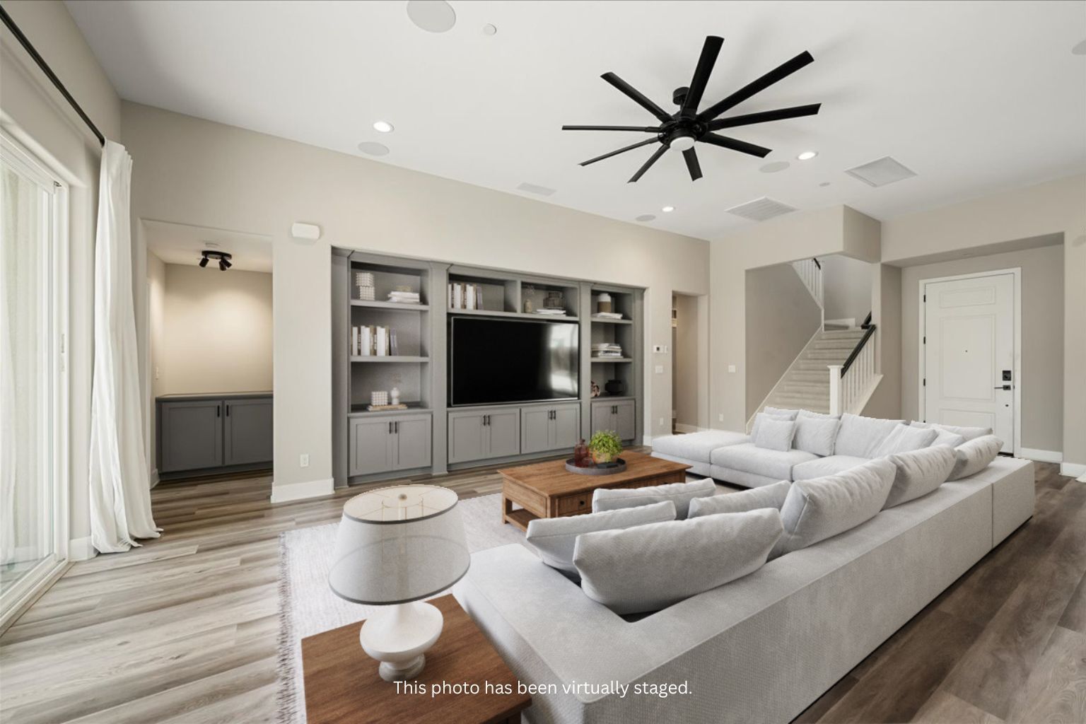 Popular great room with 11’ ceiling, modern ceiling fan, built-in entertainment system with shelving, 7.2 surround sound Klipsch speakers with Onkyo receiver and amp, oversized sliding glass doors, and a dining area.