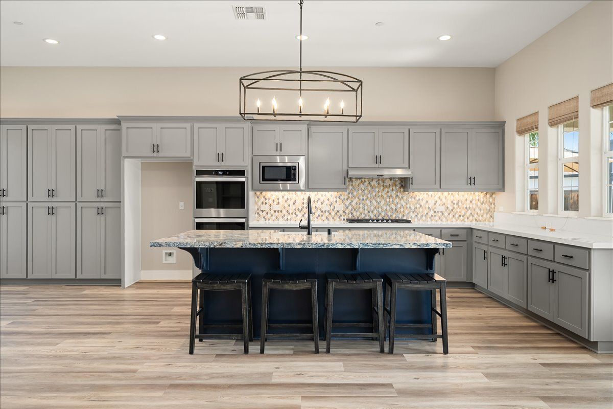 Gorgeous kitchen with quartz and granite countertops, extended shaker style beech recessed panel cabinetry, decorative tile backsplash, chandelier, and stainless steel appliances (including a double oven and built-in cooktop).