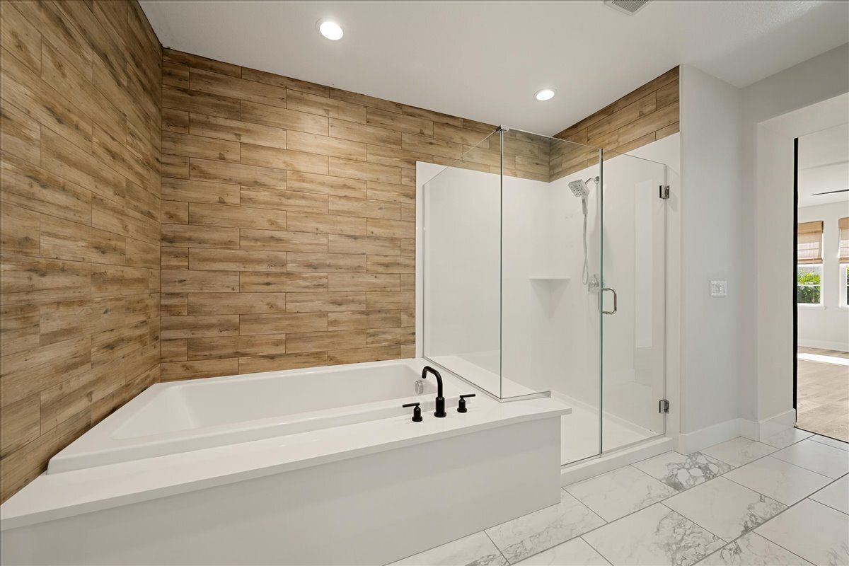Double sliding barn doors lead to the spa-like primary bath with a large dual sink vanity with e-stone countertops, soaking tub, glass enclosed shower, and custom tile walls.