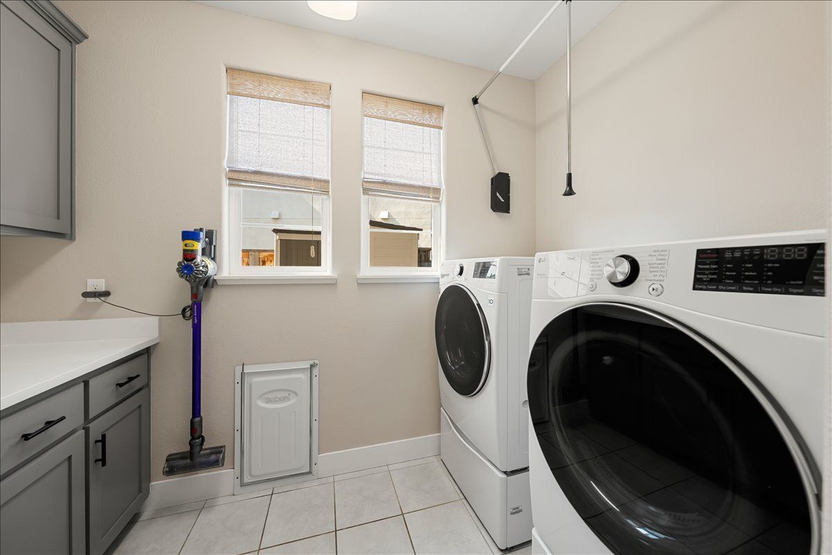 Laundry room with cabinetry, hanging rack, and pre-plumbed for a sink. Linen cabinetry and coat closet. Drop zone area with hooks, cubbies, and a bench.