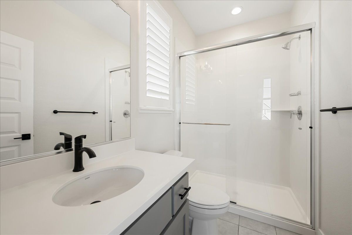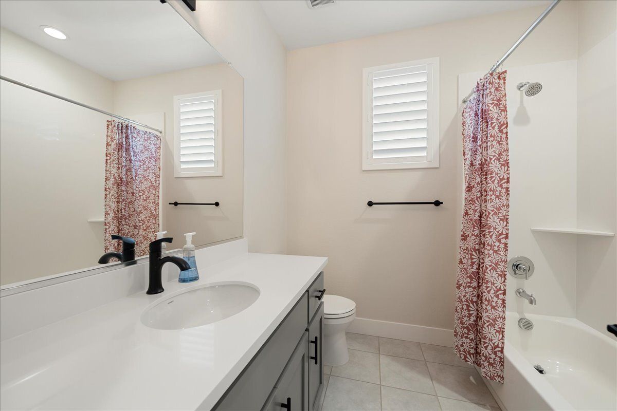 Secondary bedroom with a walk-in closet. Secondary bathroom with e-stone countertops and tub/shower combo.