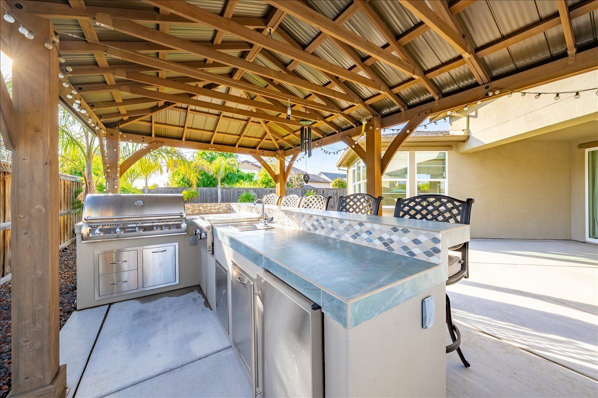 Resort style backyard with a sparkling solar heated saltwater pool with a custom rock waterfall and Cabo shelf, artificial and natural grass, multiple entertaining areas, a covered patio with ceiling fan, and a gazebo with an outdoor built-in kitchen with bar seating, a serving surface, a BBQ, a flat top grill, a refrigerator, and a sink.