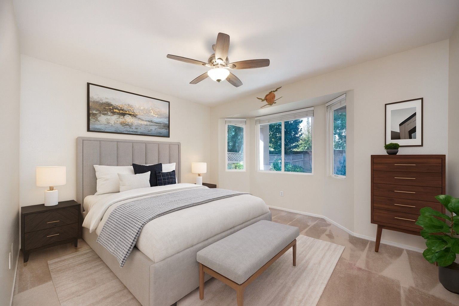 The spacious primary suite offers bay windows, a ceiling fan, and a large walk-in closet.