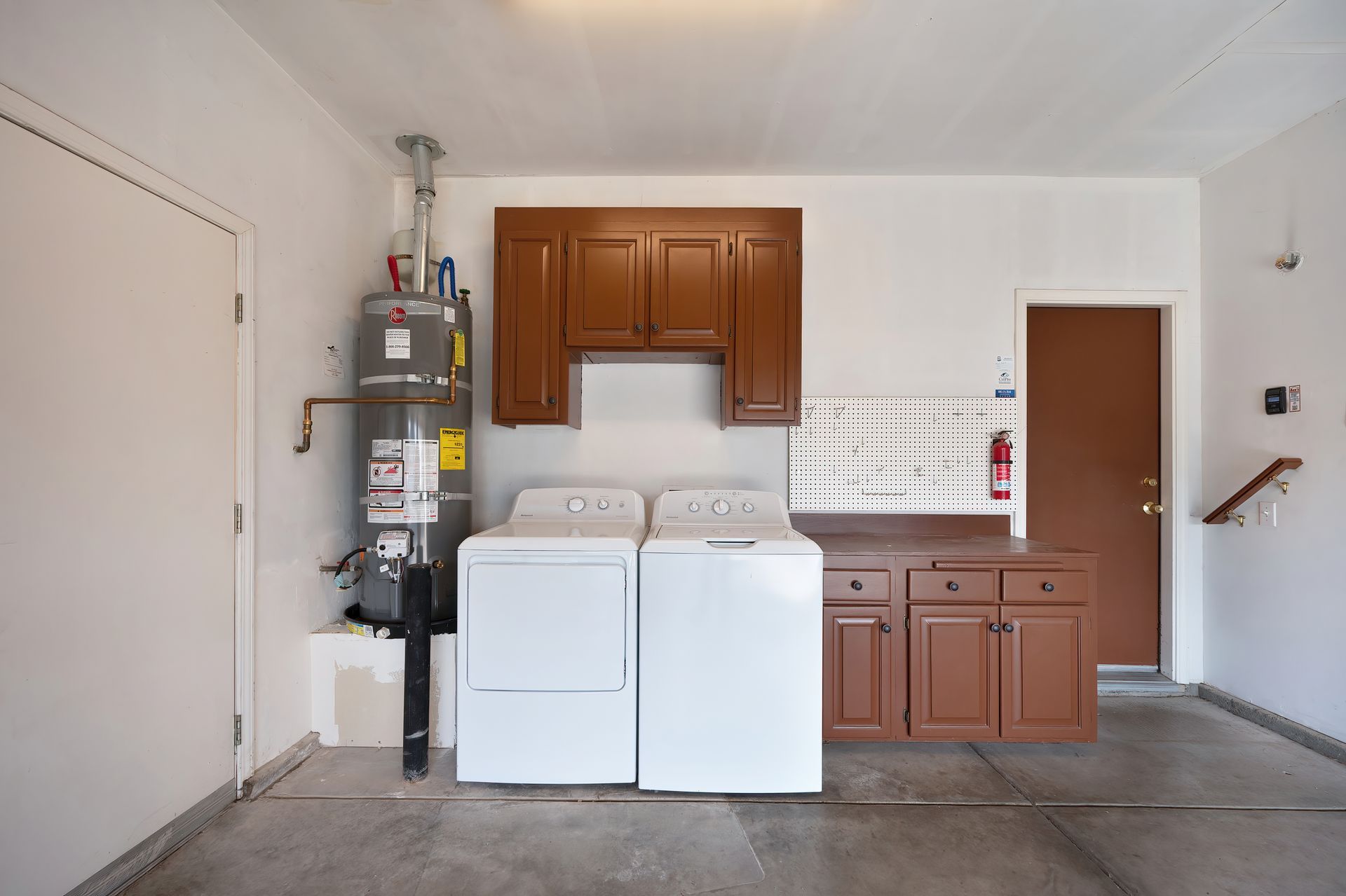 Two car garage with cabinetry, shelving, a work bench, and laundry area. New water heater and affordable Roseville utilities.