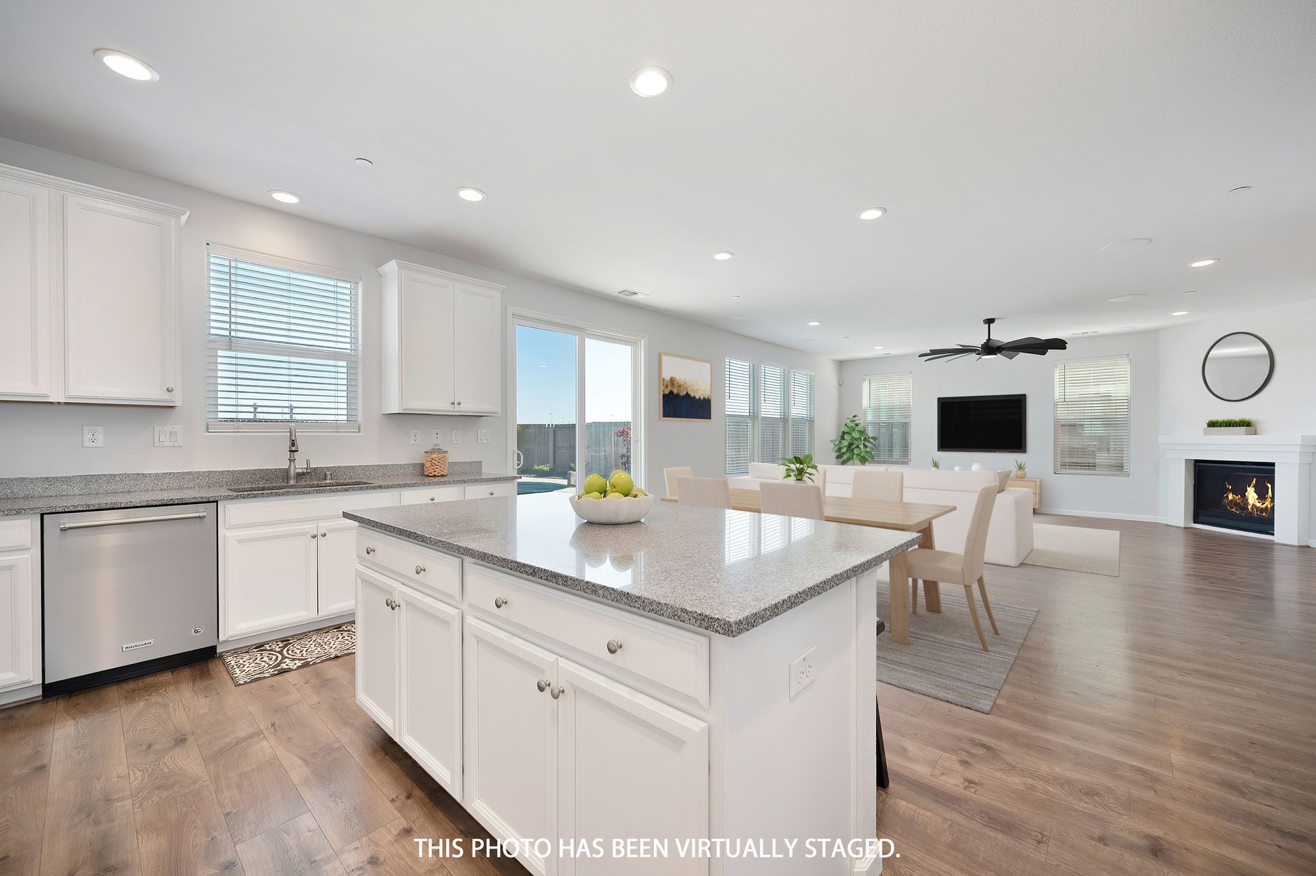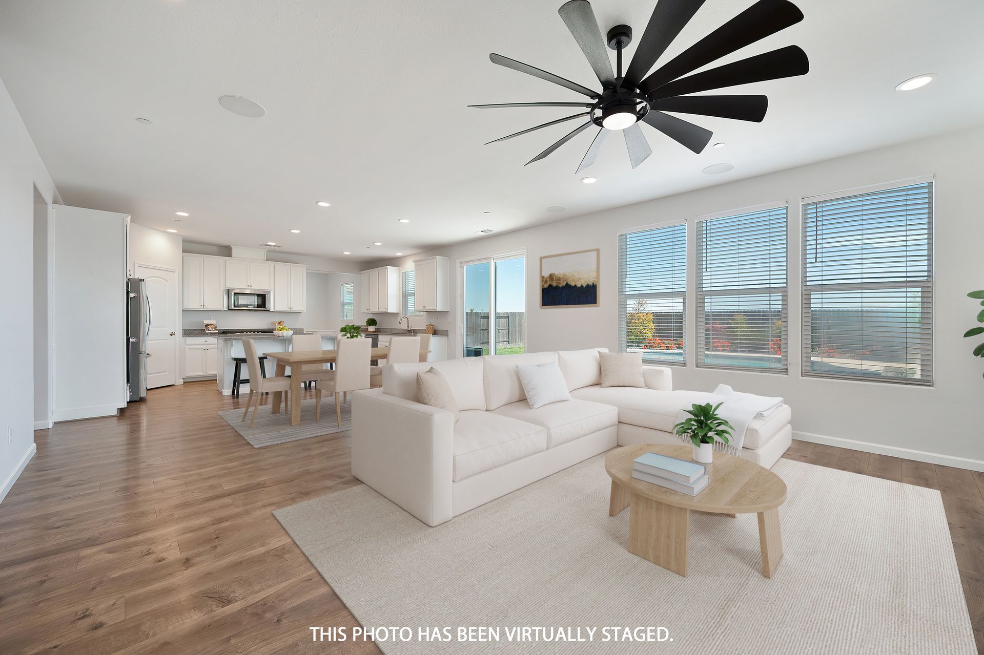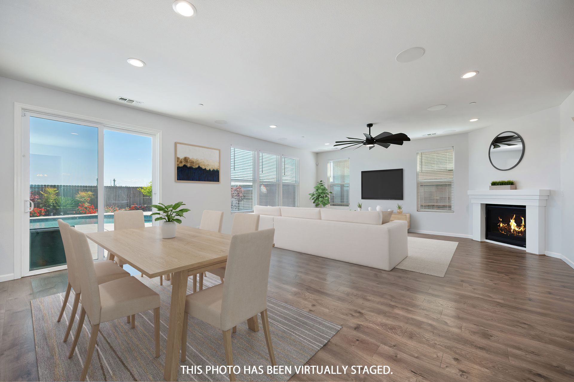 Great room with a breakfast nook, large gathering room with a cozy gas fireplace, custom surround sound system with KEF speakers, and a ceiling fan.
