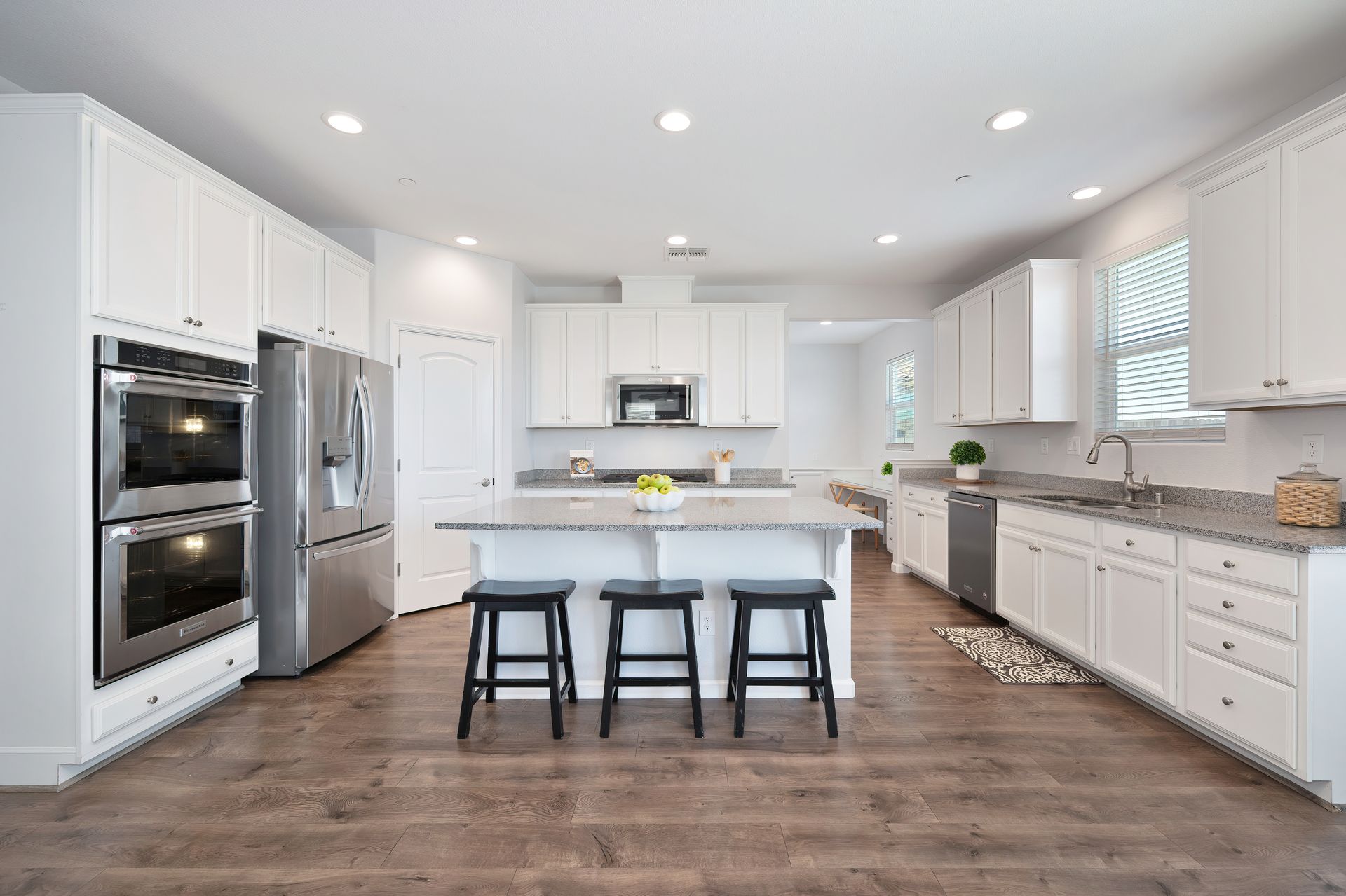 Gorgeous kitchen features a large island with counter seating, granite countertops, white cabinetry, KitchenAid stainless steel appliances including a built-in cooktop and a double oven, a walk-in pantry with organizers, and a butler’s pantry.