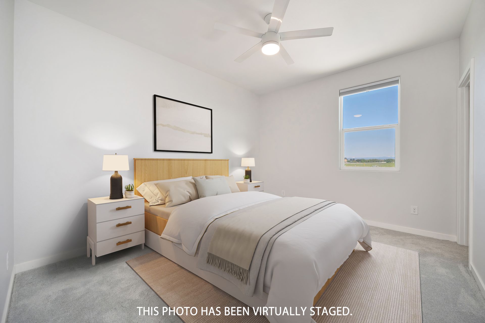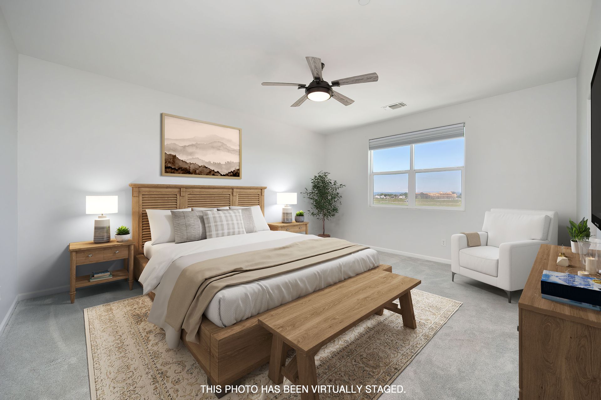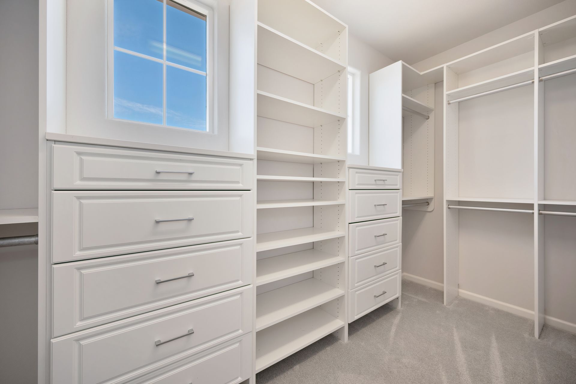 Spacious and private primary suite with a huge walk-in closet with custom organizers and windows.