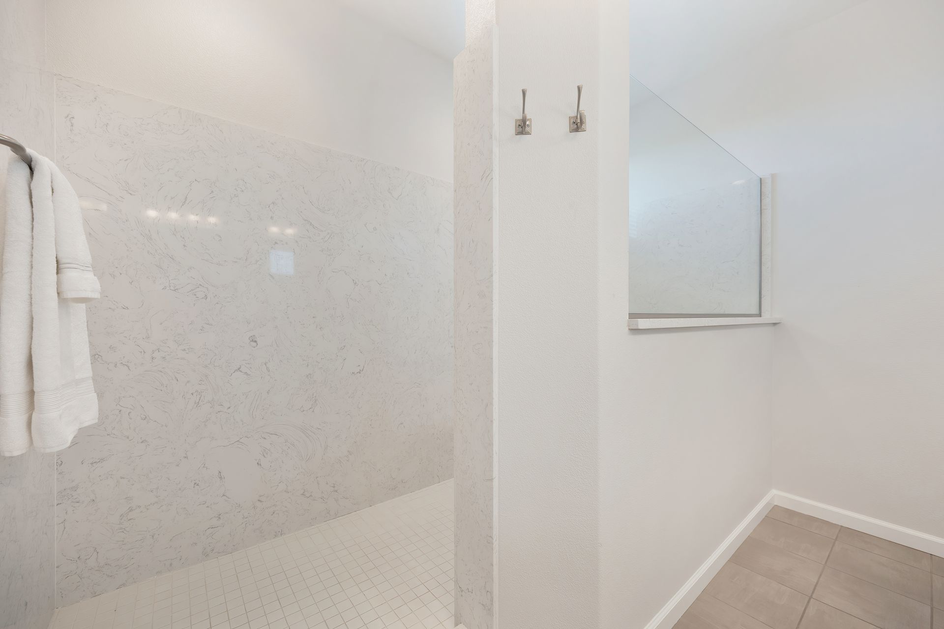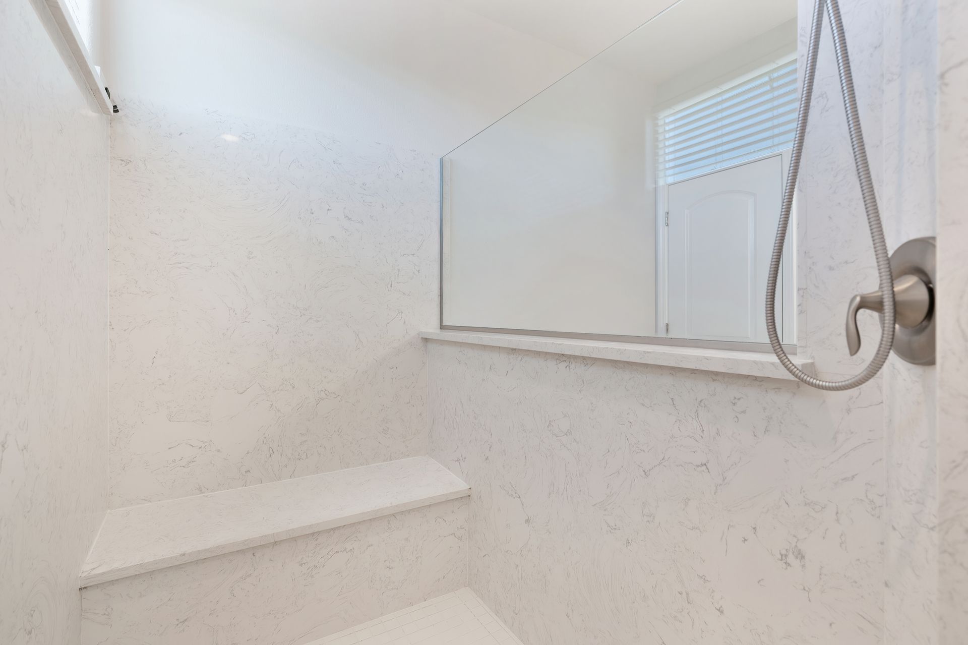 Elegant primary bath with a dual sink vanity with Piedrafina marble counters, a super shower with a bench and Piedrafina marble surround.