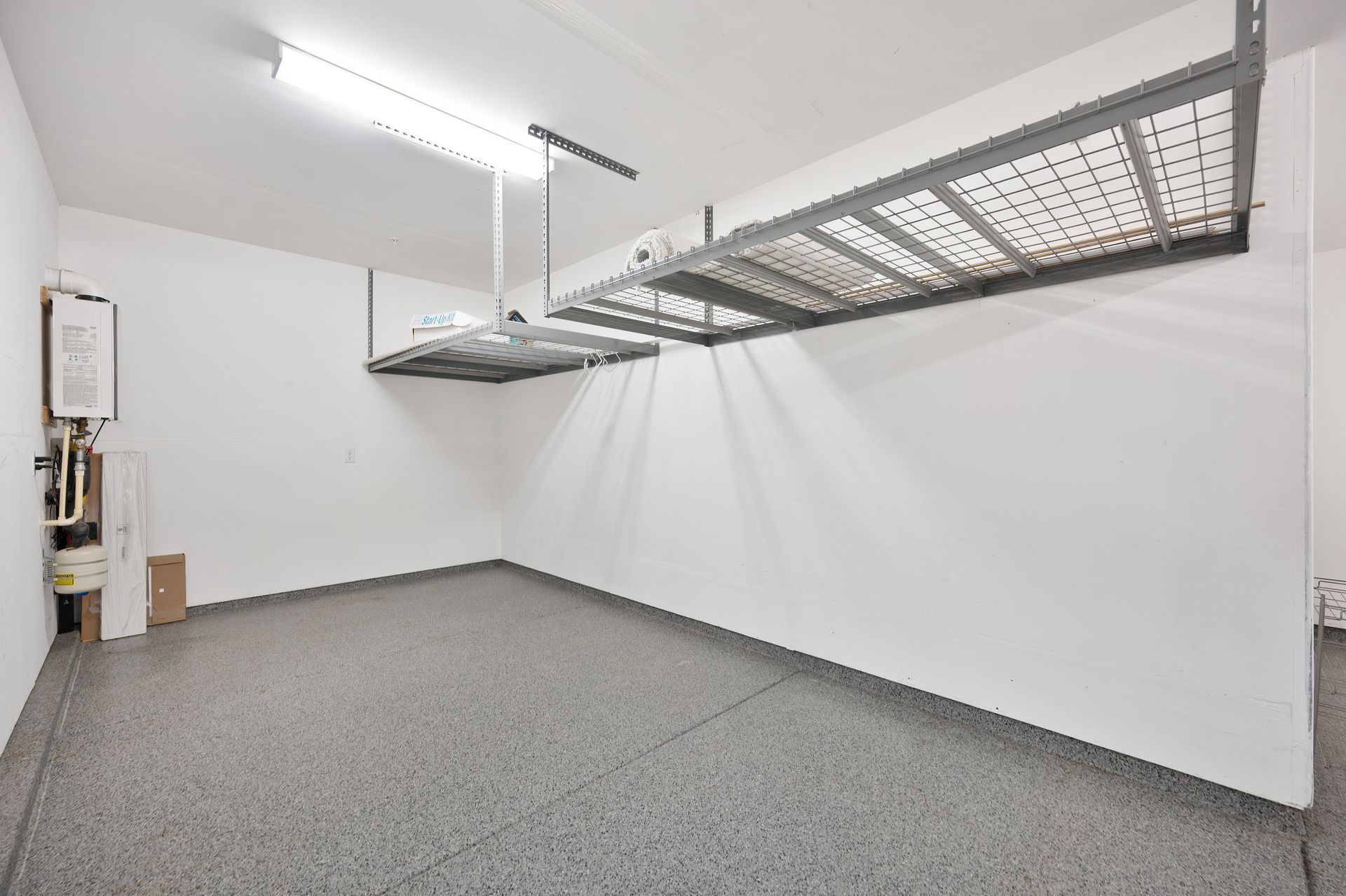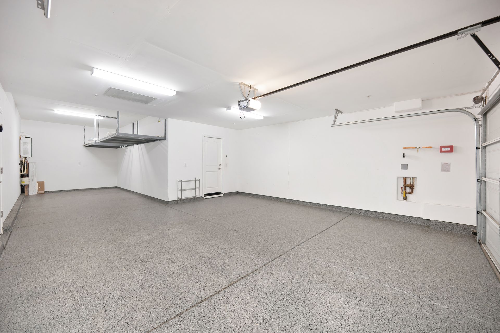 3-car tandem garage with a dedicated EV outlet, overhead storage racks and epoxied floor.