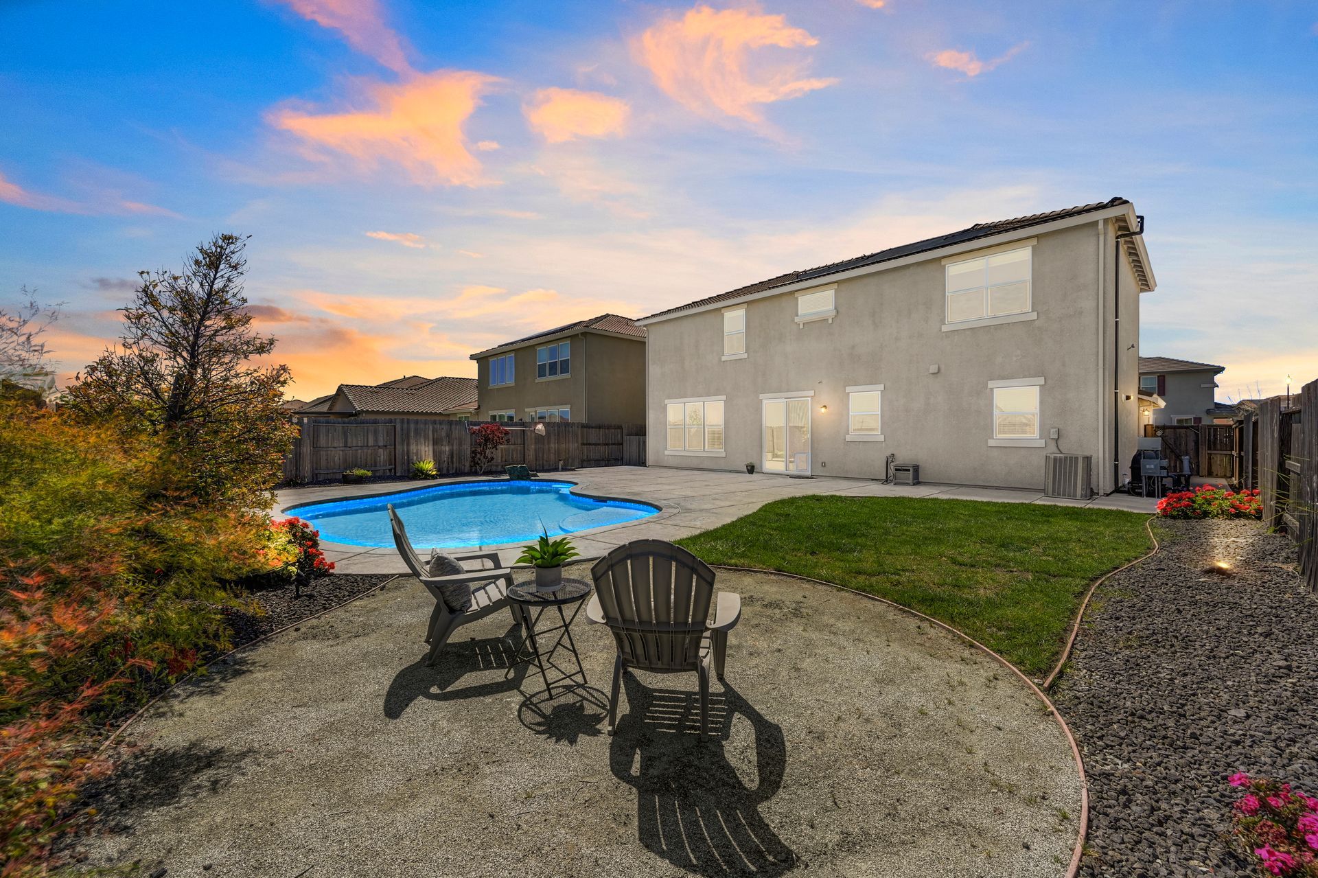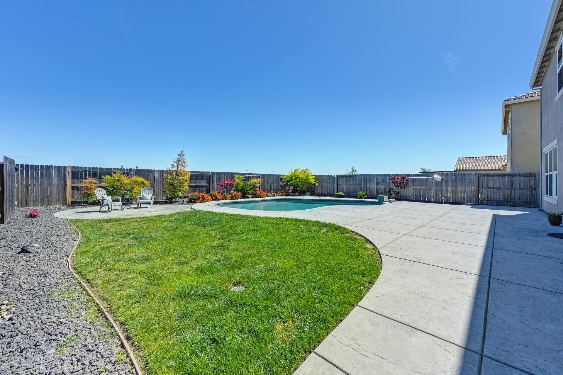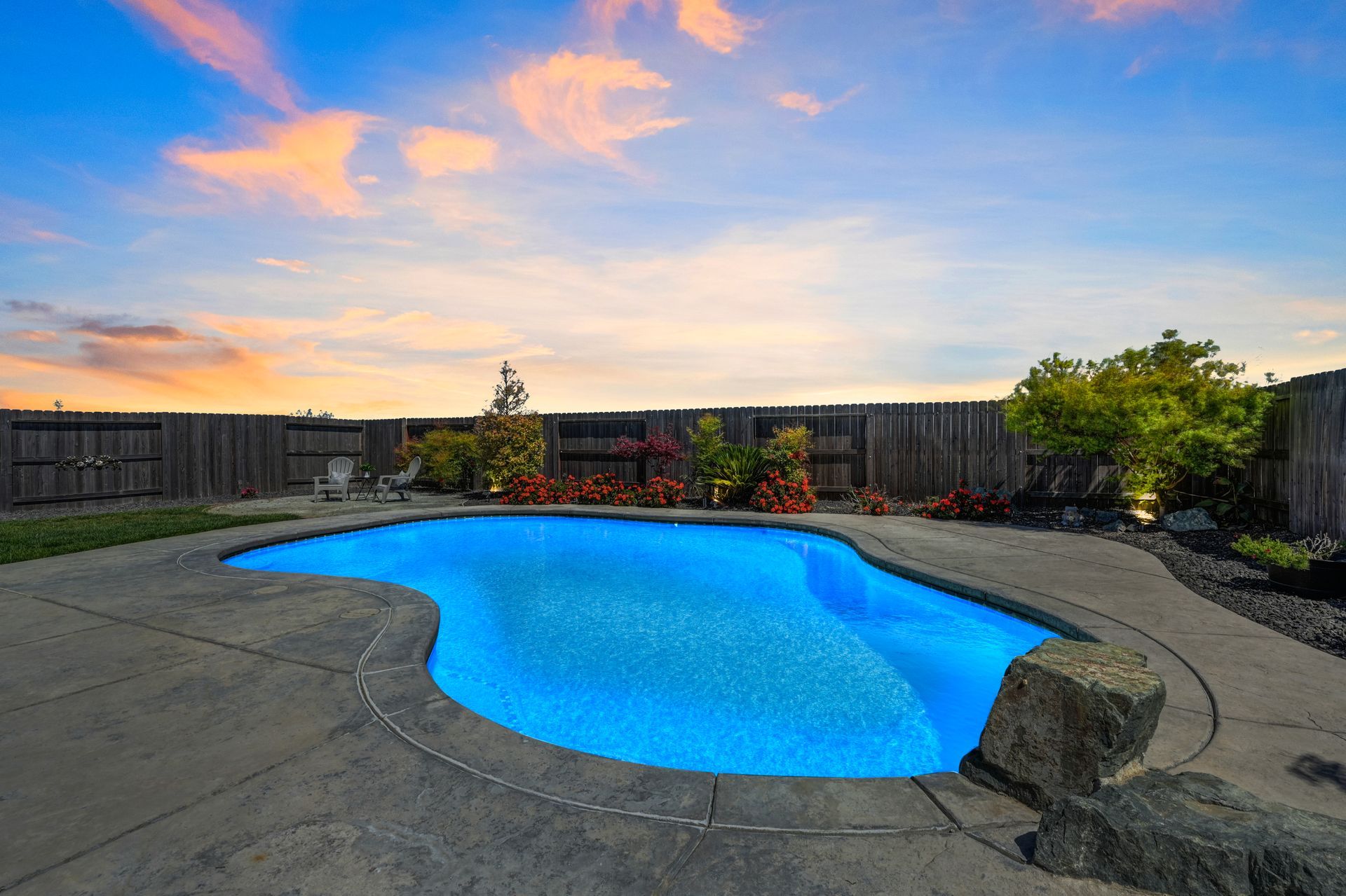 Entertain in the resort style backyard with a sparkling pool with solar, a diving rock, and a cabo shelf, stamped concrete, grass, and a dog run.