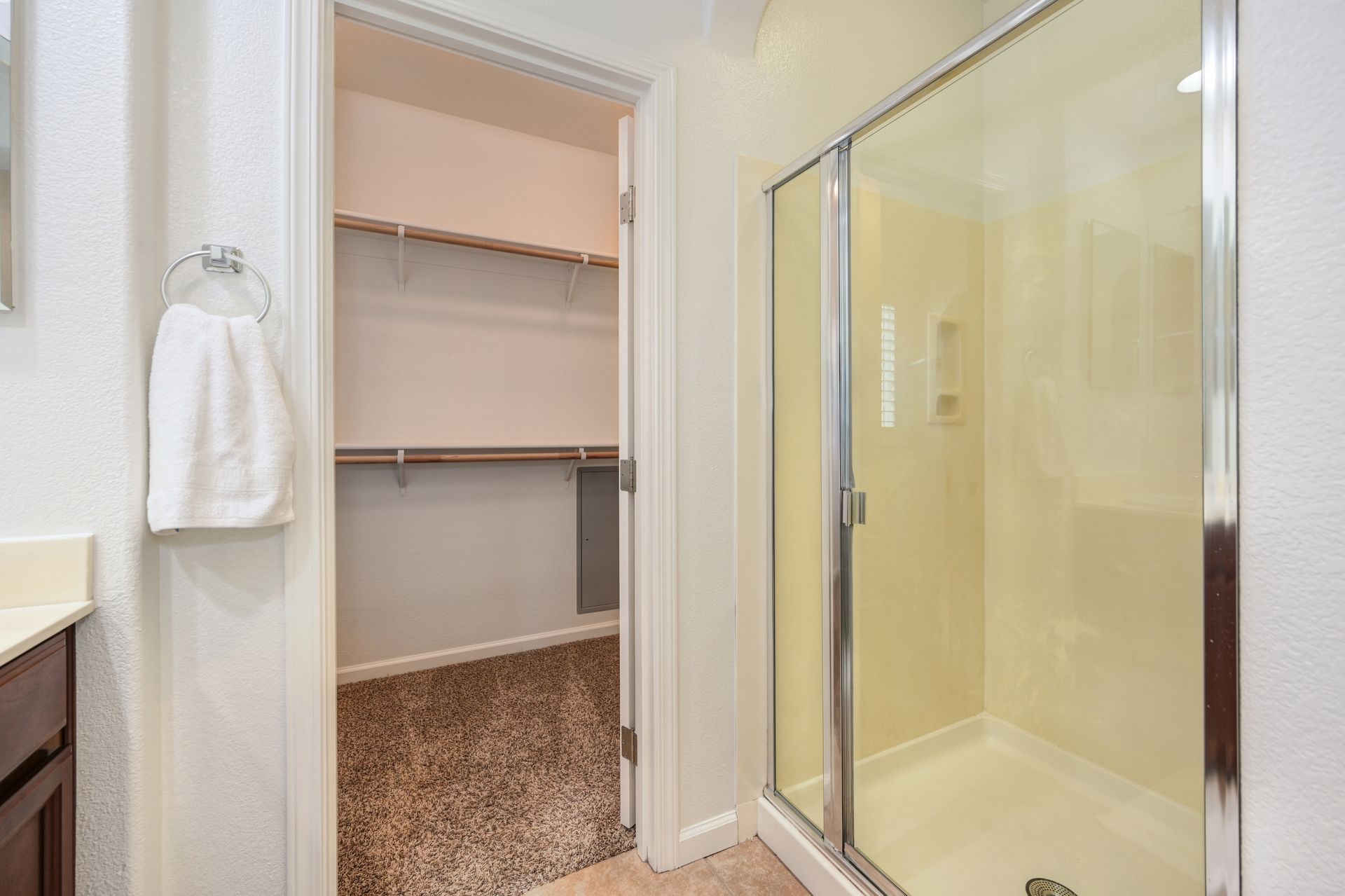 Elegant primary bathroom with a dual sink vanity and a glass enclosed shower.