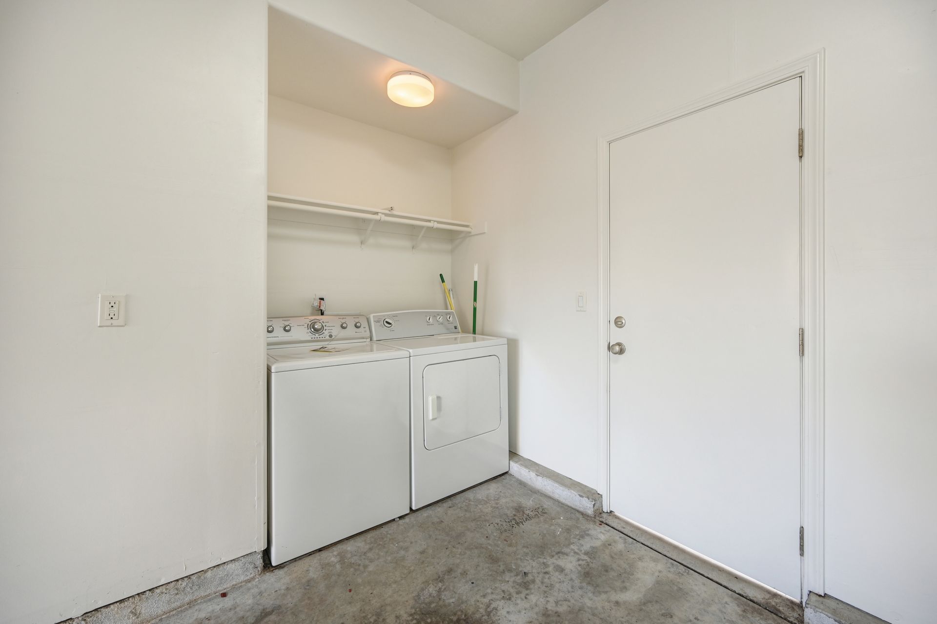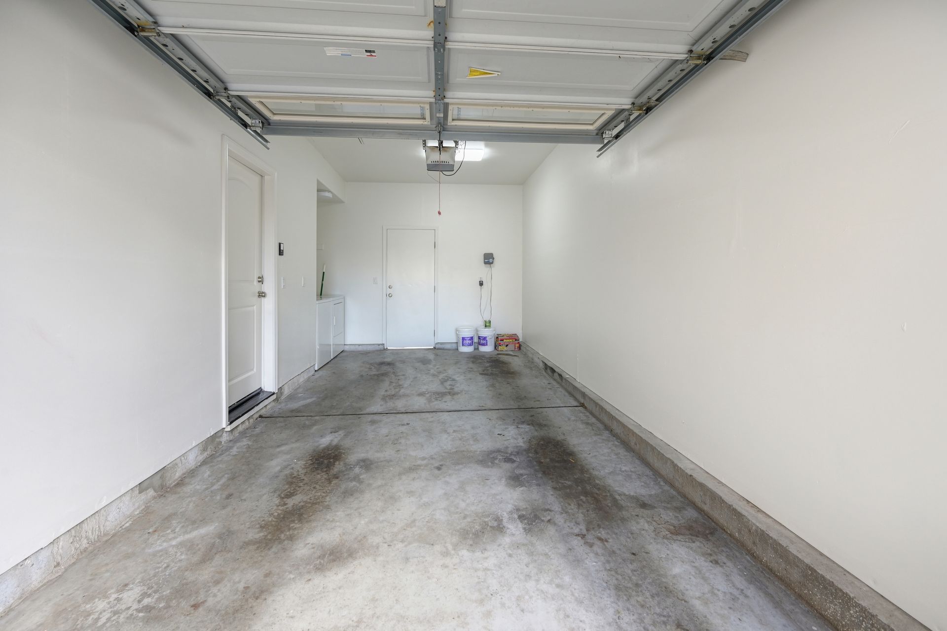 Finished and painted split 2-car garage (one with a laundry area with shelving.)