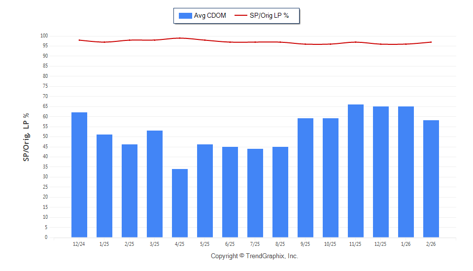 The Days on Market Showed Neutral Trend: The average Days on Market (DOM) shows how many days the average property is on the market before it sells. An upward trend in DOM trends to indicate a move towards more of a Buyer’s market, a downward trend indicates a move towards more of a Seller’s market. The DOM for February 2026 was 54, down 10% from 60 days last month and up 25.6% from 43 days in February of last year.