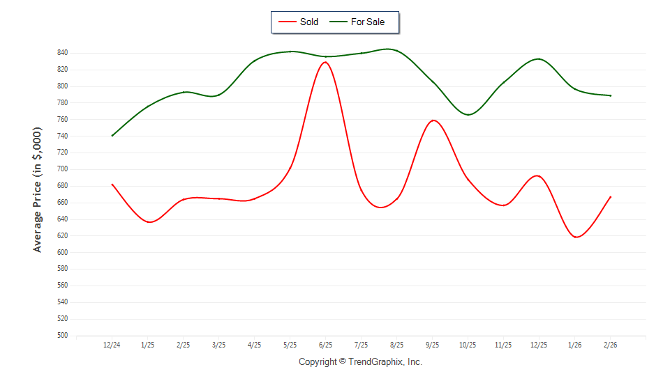 The Average Sold Price was Neutral: The Average Sold Price in February was $667,000, up 0.5% from $664,000 in February of 2025 and up 7.8% from $619,000 last month.