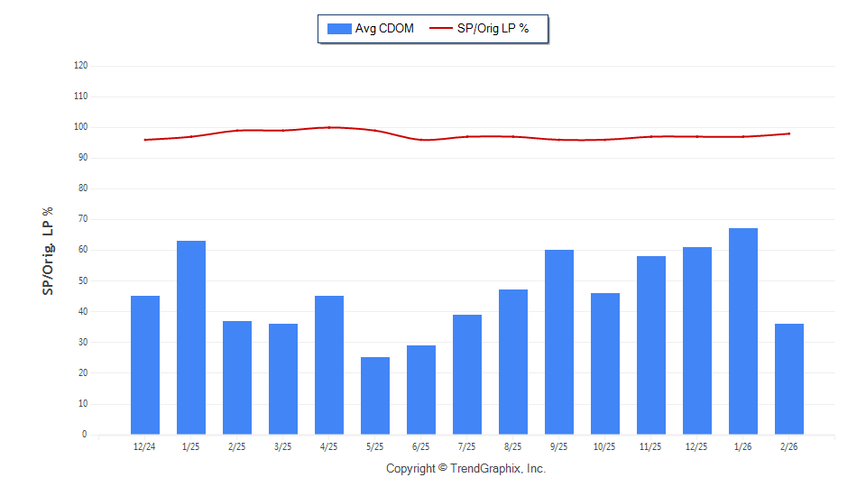 The Days on Market Showed Downward Trend: The average Days on Market (DOM) shows how many days the average property is on the market before it sells. An upward trend in DOM trends to indicate a move towards more of a Buyer’s market, a downward trend indicates a move towards more of a Seller’s market. The DOM for February 2026 was 28, down 45.1% from 51 days last month and down 20% from 35 days in February of last year.