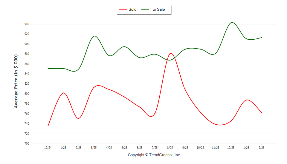 The Average Sold Price was Neutral: The Average Sold Price in February was $763,000, up 1.6% from $751,000 in February of 2025 and down 3.2% from $788,000 last month.